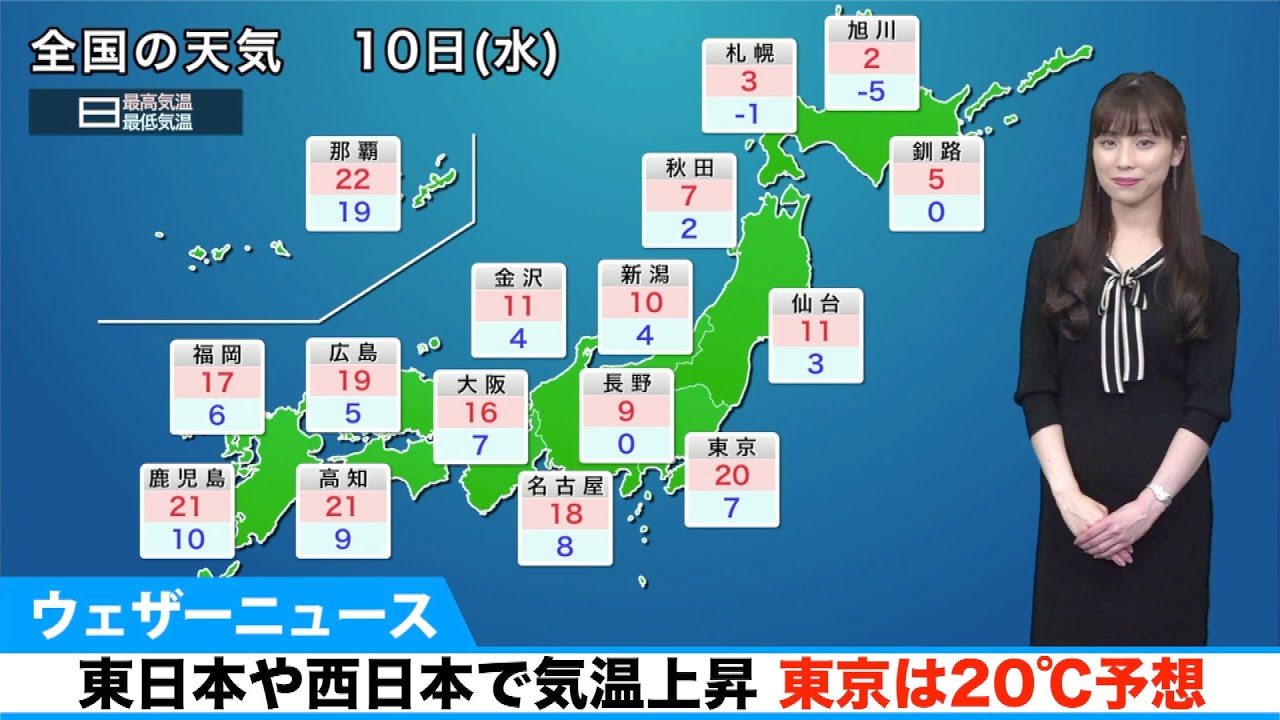 明日10日(水)は東日本から西日本では今日よりさらに気温が上がる見込みです。今日9日(火)、寒さが和らいだ関東は、明日はさらに気温が上がります。 高気圧に覆われて晴れる上、暖かな空気が入るため、各地で18℃前後まで上がり、東京では20℃まで上がる予想です。その他、東海から西のエリアでも気温が上がって、軒並み15℃以上まで上がり、20℃以上となる所もあります。昼間は上着がなくても過ごせるくらいとなりそうです。 2021Casterウェザーニュースキャスターゲリラ豪雨ゲリラ雷雨ニュース乾燥予報停電北日本台風台風情報地震大雨大雪天気天気予報天気痛情報暴風東日本気象気象予報士洗濯減災西日本防災