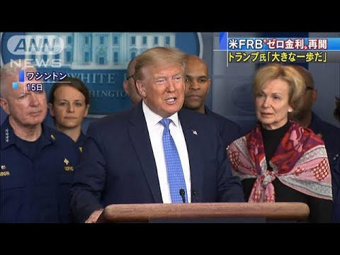FRBは15日、「新型コロナウイルスの感染が地域社会を傷付け、経済を混乱させている」として政策金利を一気に1%引き下げ、「年0.0%から0.25%」の範囲に引き下げると発表しました。事実上のゼロ金利政策を約4年ぶりに導入します。また、今後、7000億ドル、約75兆円分のアメリカ国債などを買い入れて経済の下支えにあらゆる手段を動員するとしています。FRBのパウエル議長は「新型コロナウイルスがアメリカや世界の人々に甚大な影響を及ぼしている」という厳しい認識を示しました。一方で、アメリカが景気後退入りするという見方は否定しました。