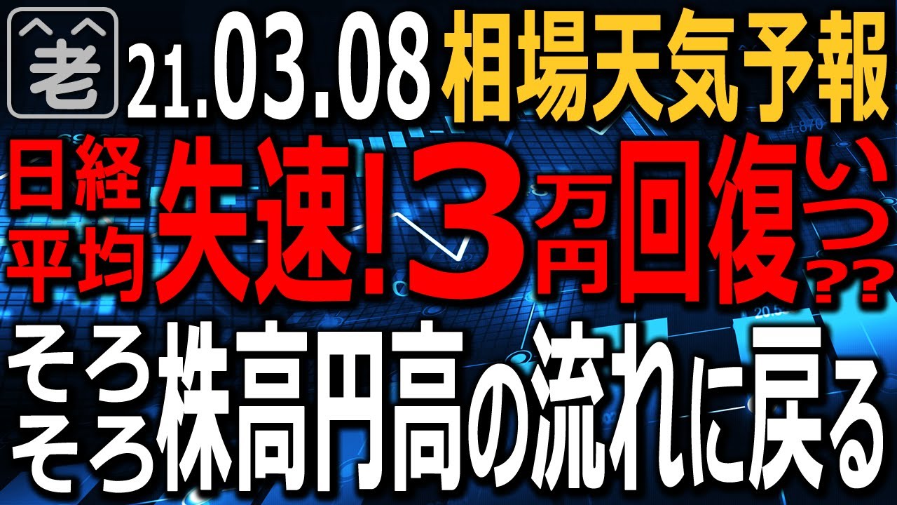 2021年3月8日(月)の相場天気予報です。週末の米市場は雇用統計の改善が好感されて大幅反発しました。ただ日経平均は高く寄りついた後に失速し、上値が重くなっています。ドルは高止まり、下がる気配なし。原油も高値更新など、金利上昇懸念から相場は波乱気味でトレードが難しくなっています。この流れはいつまで続くのでしょうか?ラジオヤジの実践的な相場解説です。