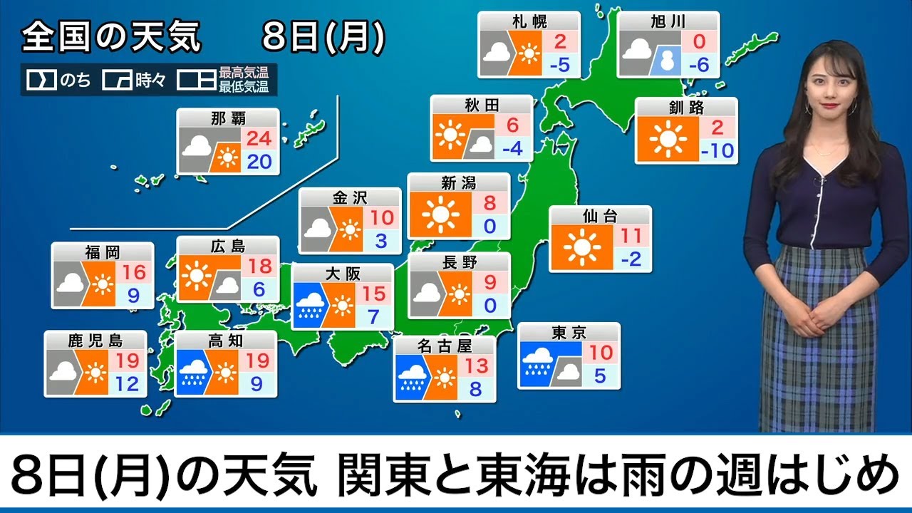 8日(月)は本州の南海上を進む低気圧の影響で、関東や東海の沿岸部で雨が降る見込みです。西日本は天気が回復して次第に晴れてきます。日差しが戻るとともに暖かくなりそうです。 2021Casterウェザーニュースキャスターゲリラ豪雨ゲリラ雷雨ニュース乾燥予報停電北日本台風台風情報地震大雨大雪天気天気予報天気痛情報暴風東日本気象気象予報士洗濯減災西日本防災