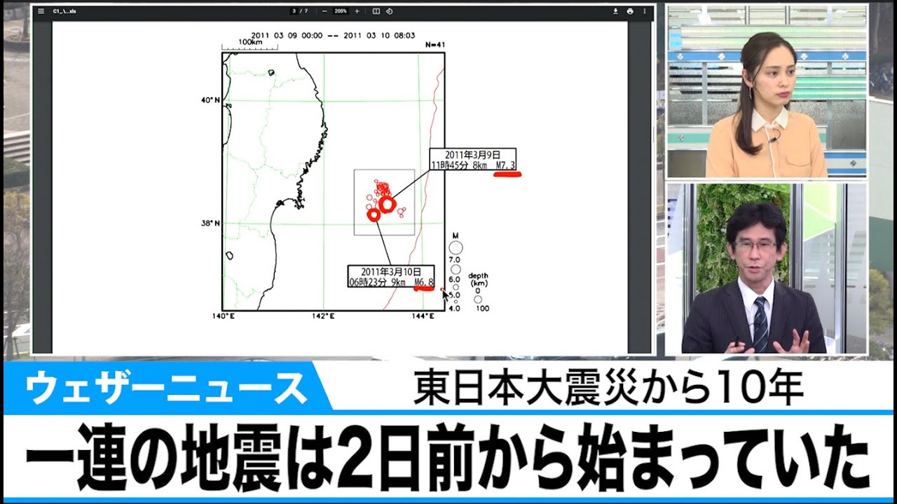 その始まりは2日前の3月9日に三陸沖で発生したM7.3の地震。最大震度5弱、東北の太平洋側で津波を観測。当時、30年以内の発生確率が99%とされていた宮城県沖地震とは震源域にずれがあり、いよいよかと思われた矢先の出来事でした。