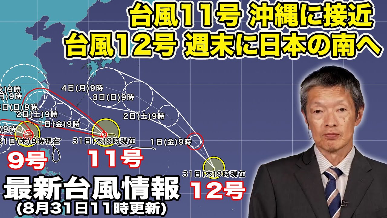 台風11号は今夜から明後日にかけて沖縄に接近するため、高波に警戒、強風には十分な注意が必要です。昨夜発生した台風12号は週末に日本の南に北上してくる見通しになっています。