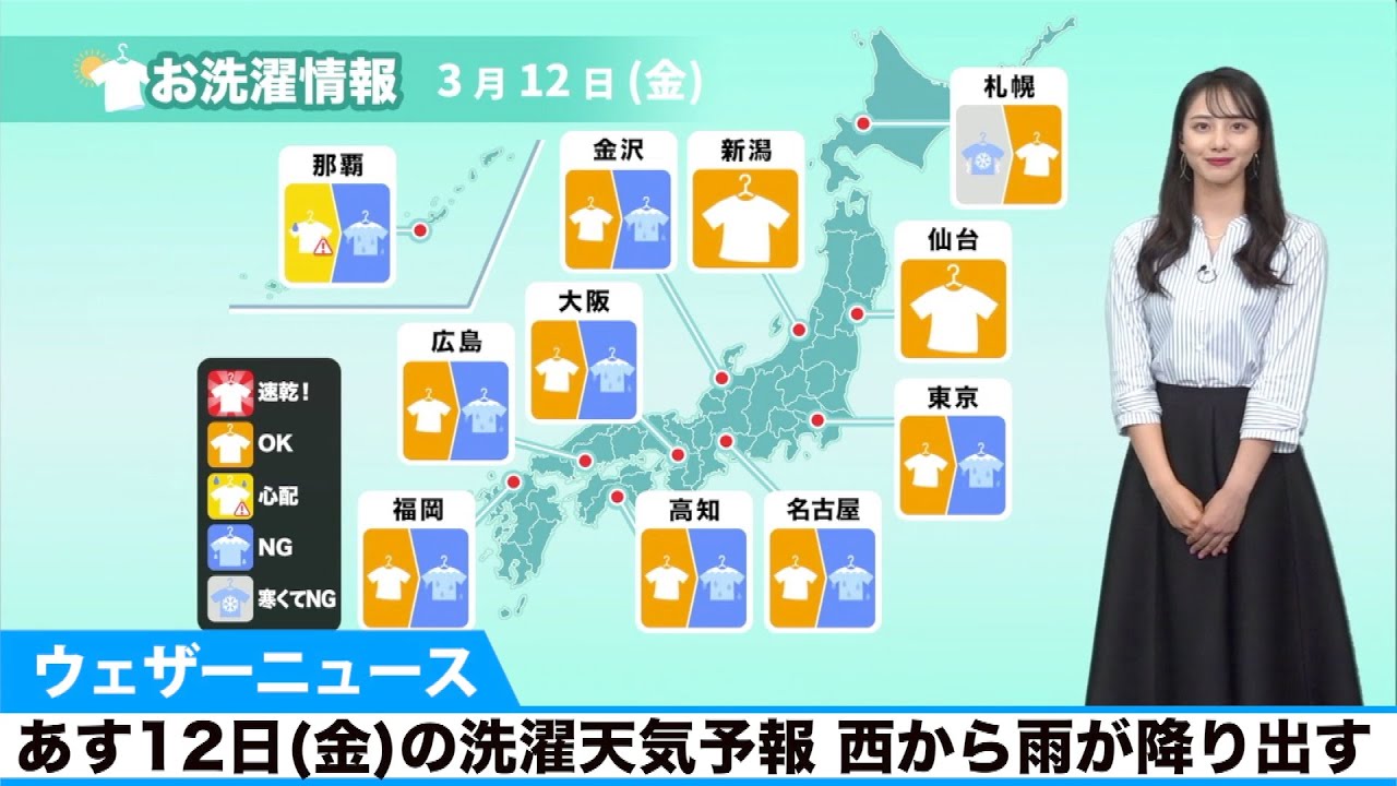 明日12日(金)は、低気圧が東シナ海から西日本を進みます。 この影響で西日本では雨が降り、太平洋側では本降りの雨になります。東海や関東も湿った空気の影響で、日中は次第に雨が降り出す見込みです。全国的にスッキリ洗濯日和とはならなさそうです。 2021Casterウェザーニュースキャスターゲリラ豪雨ゲリラ雷雨ニュース乾燥予報停電北日本台風台風情報地震大雨大雪天気天気予報天気痛情報暴風東日本気象気象予報士洗濯減災西日本防災
