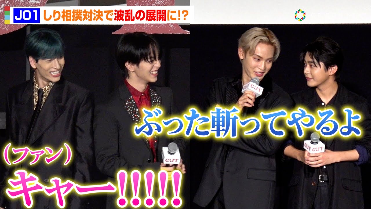 11人組男性グループ・JO1の與那城奨・大平祥生・金城碧海が10月1日、都内で行われた映画『OUT』(11月17日公開)完成披露上映会に登場。倉悠貴、醍醐虎汰朗、与田祐希(乃木坂46)、水上恒司、品川ヒロシ監督も登壇した同イベントで、尻相撲対決が行われた。