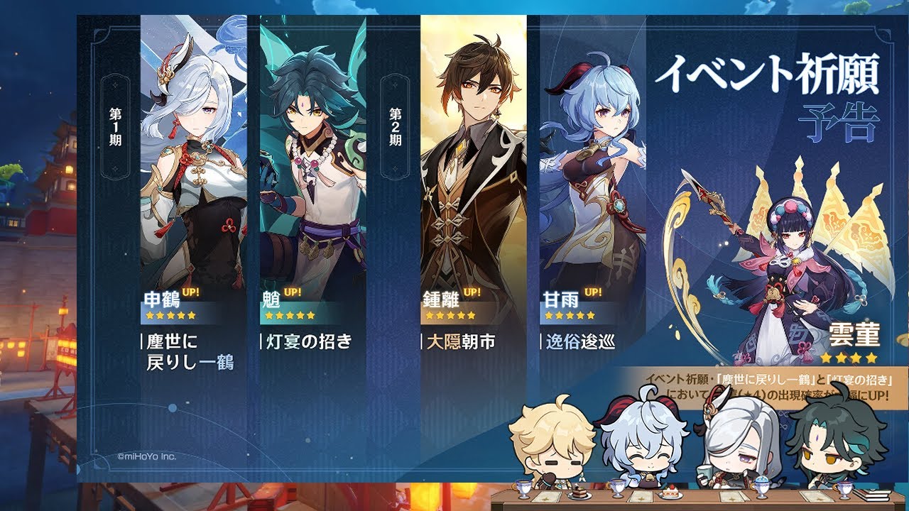 この動画では、アップデート4.4のカイトウサイ、リーユエでのキャラクターの復刻についてお話しします。では、楽しんでいただきましょう!まず第一に、10月17日にはアップデート4.1の後半がスタートします。ガチャの構成は公式に発表されています。リオセスリとウェンティのガチャにはトーマ、ドリー、そして重雲が登場します。それでは、続けていきます。なお、次の情報は開発中であり、変更される可能性があるため、100%信頼しないでください。