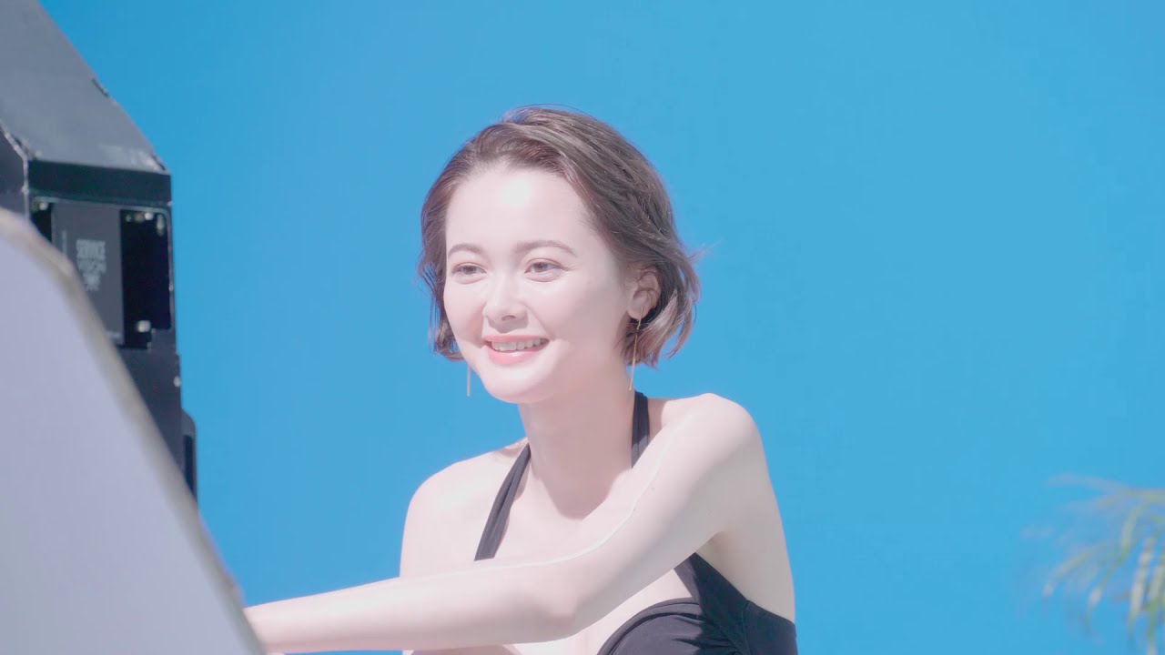 商品の特長であるサラリとした塗り心地を肌に滑らせ表現するシーンでは、撮影スタッフもうっとり。照り付ける日差しの中でも、玉城の輝く美肌が際立つ新CMとなった。
