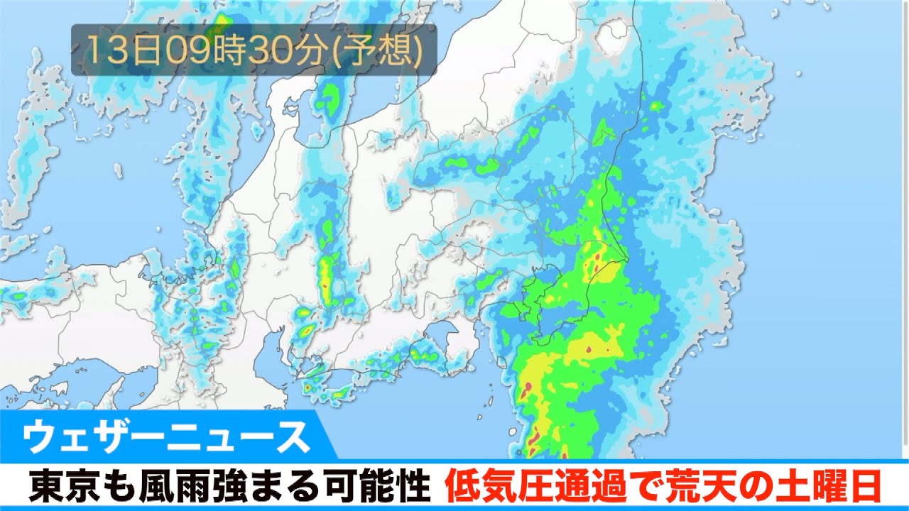 今日13日(土)は、前線を伴った低気圧が西から進んでいて関東の各地で雨が降り出しています。低気圧が近づくにつれて強い雨の範囲は広がり、昼過ぎにかけては東京都心など各地で土砂降りとなる見込みです。