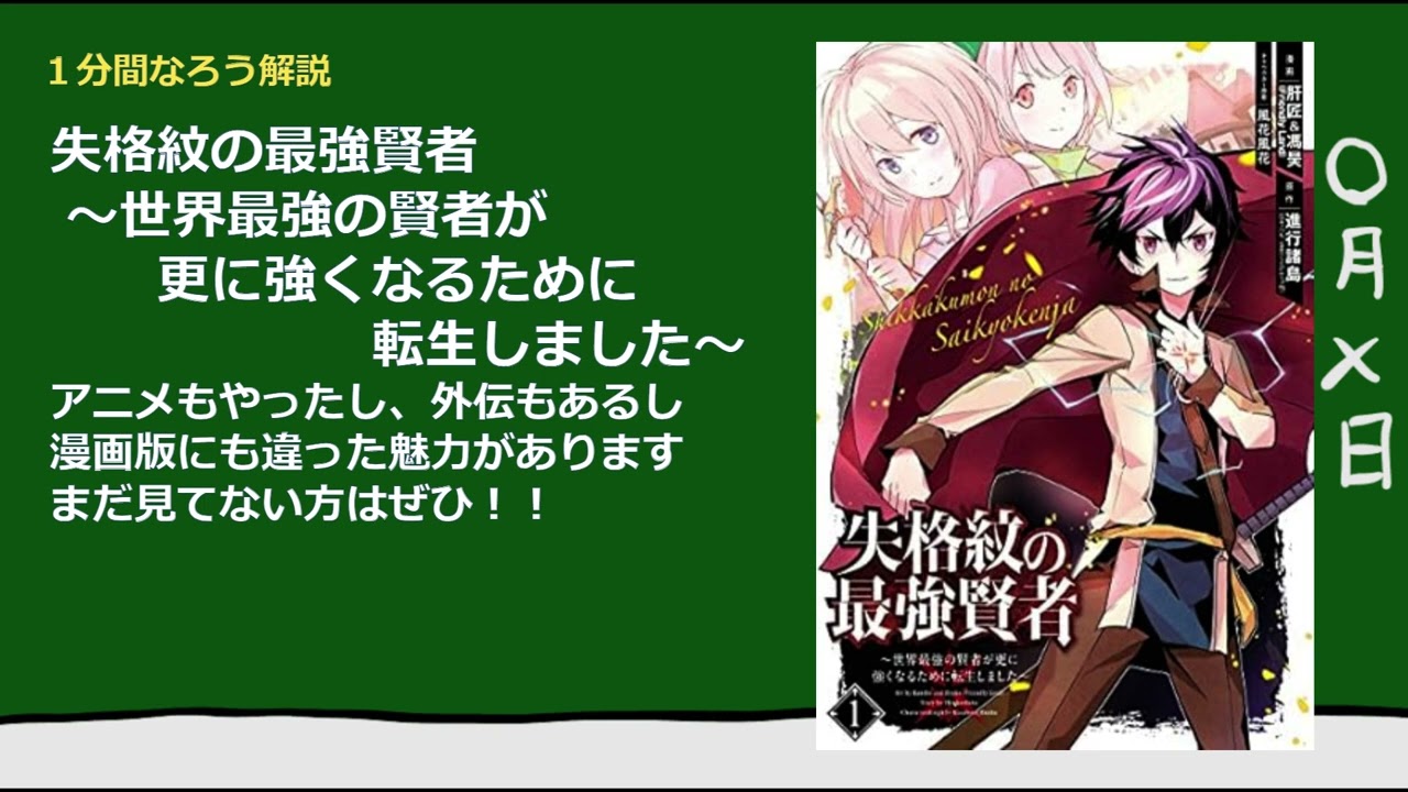 なろう系漫画作品を解説?紹介?していきます! アニメ化していない作品も見ようぜ! アニメ化してる作品ももちろん読もうぜ!! なろう原作じゃなくても異世界系はなろう系と呼んじゃうんだぜ!!! 1分きっても1分なんだぜ(錯乱) 1分超えても1分だぜ(困惑) たまに普通の漫画も紹介するんだぜ! ♯1分間なろう解説 CV:つくよみちゃん@COEIROINK なろう系失格紋の最強賢者