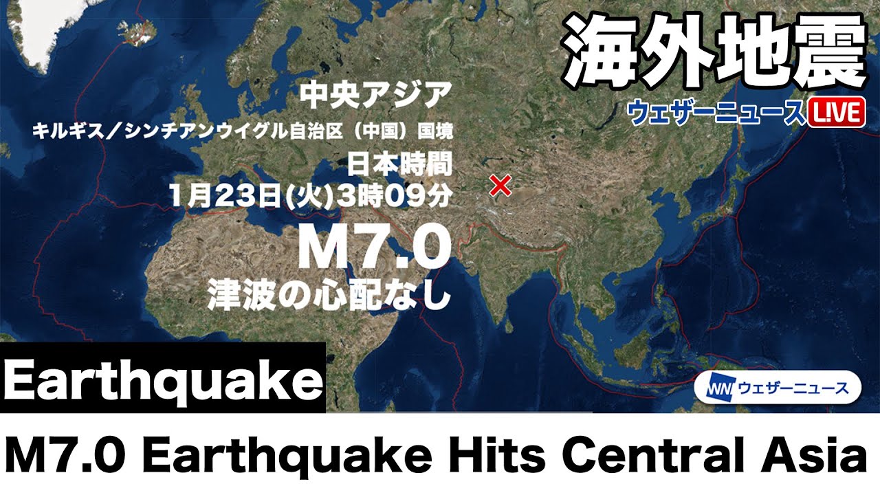 日本時間の1月23日(火)3時09分頃、海外で地震がありました。震源地は中央アジア(キルギス/シンチアンウイグル自治区(中国)国境付近)で、震源の深さは13km、地震の規模(マグニチュード)は7.0と推定されます。