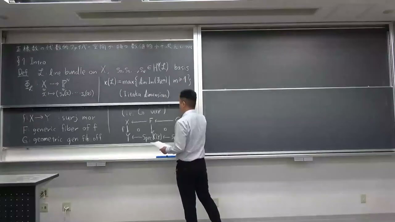 概要 飯高は代数的ファイバー空間の全空間、底空間および生成ファイバーについて小平次元が劣加法性を満たすと予想した。小平次元は双有理幾何学において重要な役割を果たす不変量である。中山は小平次元 に“近い”不変量として数値的小平次元を導入した。それは小平次元に一致することが予想されている。中山はさらに数値的小平次元について飯高の予想に類似した不等式を証明した。この不等式は極少モデル理論の進展に大きく貢献してきた。 本講演では中山の不等式を正標数において扱い、成り立つための十分条件と反例を紹介する。十分性を示すために証明した、Popa–Schnell の大域生成定理と Viehweg の弱正値性定理、藤野の大域生成定理のそれぞれの亜種についても説明する。