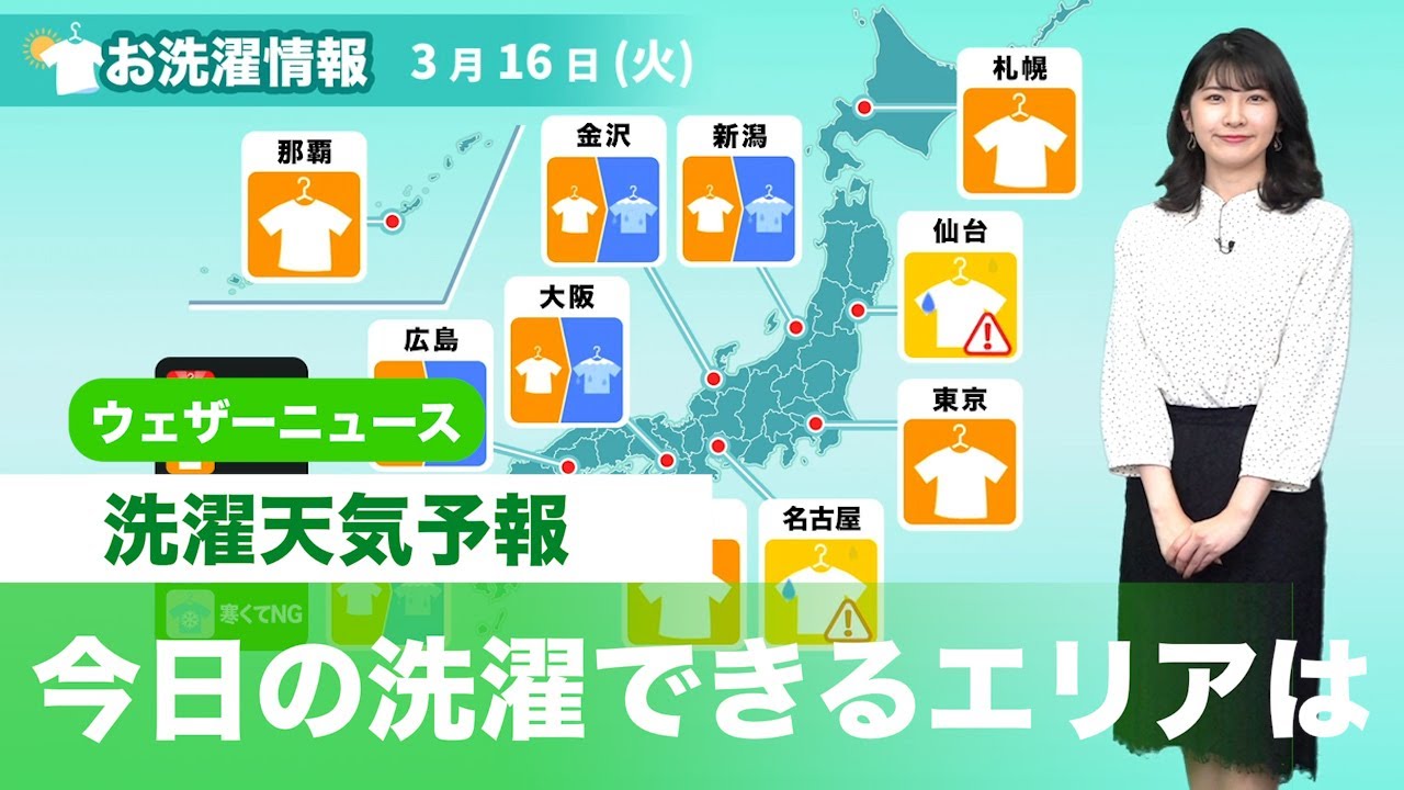 3月16日の洗濯天気予報 日本海側を中心に広く雨となるため洗濯には厳しそう。 関東は晴れて洗濯OKとなりますが、風が強まってくるため、洗濯物はしっかり飛ばされないようにしましょう! ▶︎お洗濯情報 https://weathernews.jp/s/laundry/ 2021Casterウェザーニュースキャスターゲリラ豪雨ゲリラ雷雨ニュース乾燥予報停電北日本台風台風情報地震大雨大雪天気天気予報天気痛情報暴風東日本気象気象予報士洗濯減災西日本防災