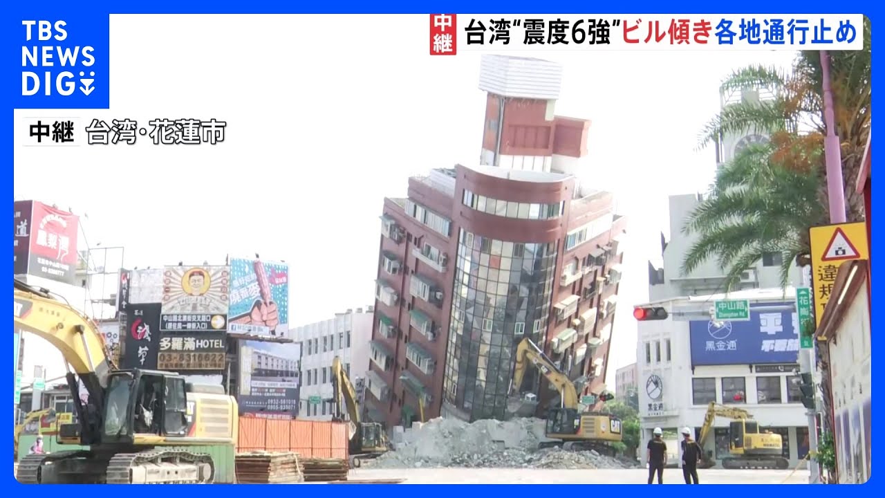 震源地に近い台湾東部の花蓮市の中心部です。後ろのビルは1階部分が崩れたため、手前に大きく傾いてしまっています。