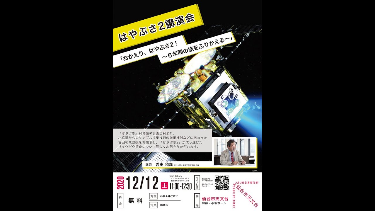 Share Facebook Twitter Pinterest LinkedIn はやぶさ2講演会「おかえり、はやぶさ2!~ 6年間の旅をふりかえる」 配信開始:2020年12月12日(土)11:00 劇場版 HAYABUSA2~REBORN