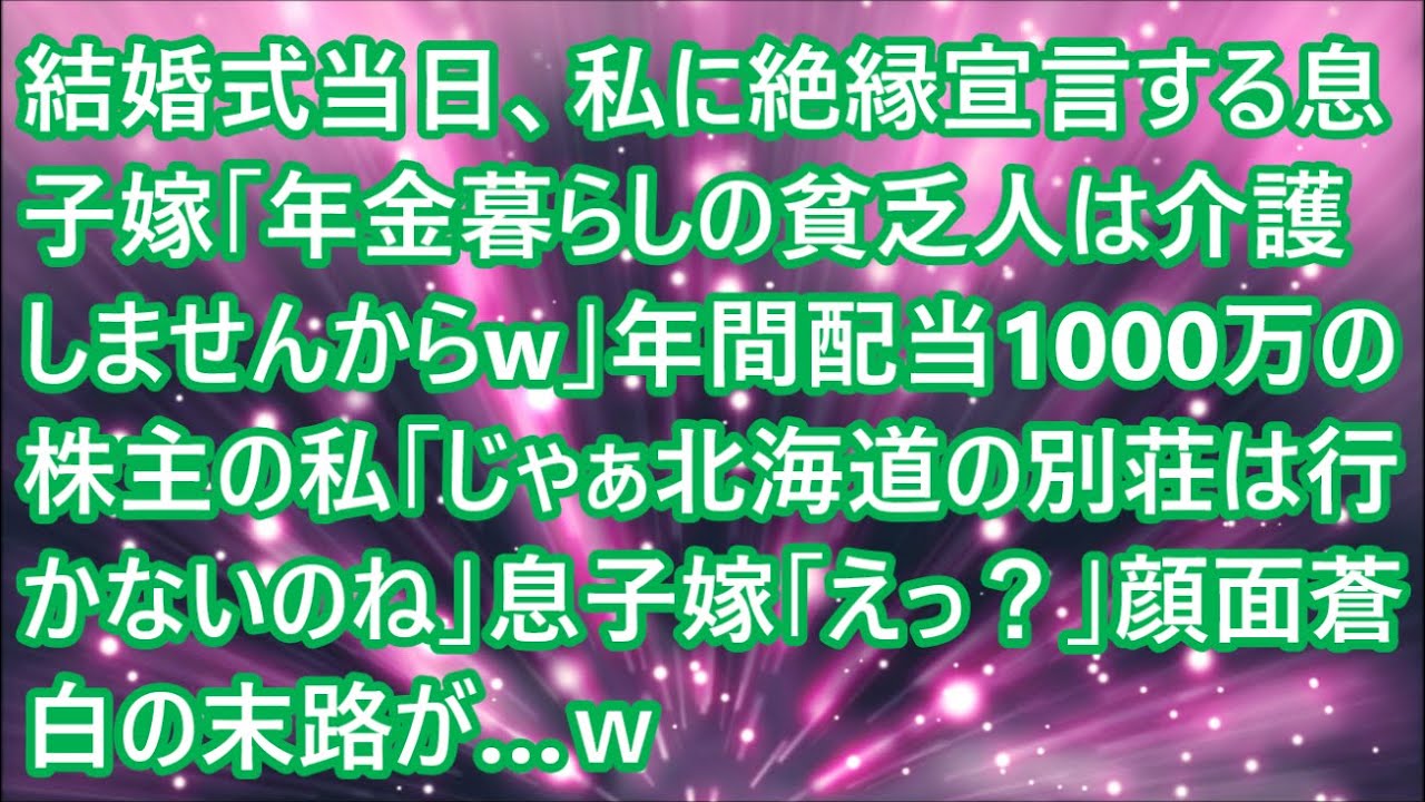【スカッとする話】結婚式当日、私に絶縁宣言する息子嫁「年金暮らしの貧乏人は介護しませんからw」年間配当1000万の株主の私「じゃぁ北海道の別荘は行かないのね」息子嫁「えっ?」顔面蒼白の末路が…w