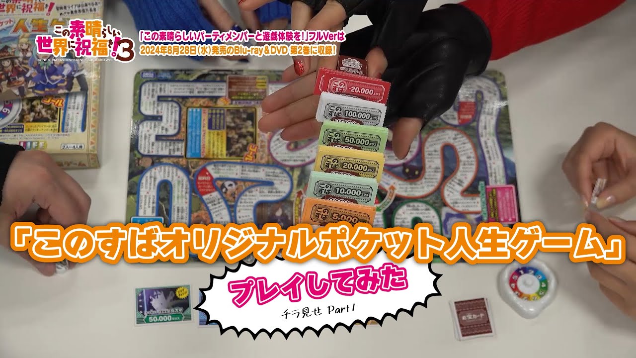 TVアニメ『この素晴らしい世界に祝福を!3』Blu-ray&DVD第2巻の特典となる「この素晴らしい世界に祝福を!」オリジナルポケット人生ゲーム プレイ動画“この素晴らしいパーティメンバーと遊戯体験を!”。チラ見せver Part1を公開いたしました!今後、全4回にわたってチラ見せ映像をお届け予定!