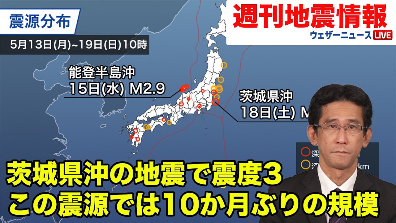 能登半島周辺の地震はまだ多く、太平洋側の広い範囲で地震が散発しています。震度3以上の地震は3回発生しました。(5月13日~5月19日10時の集計)