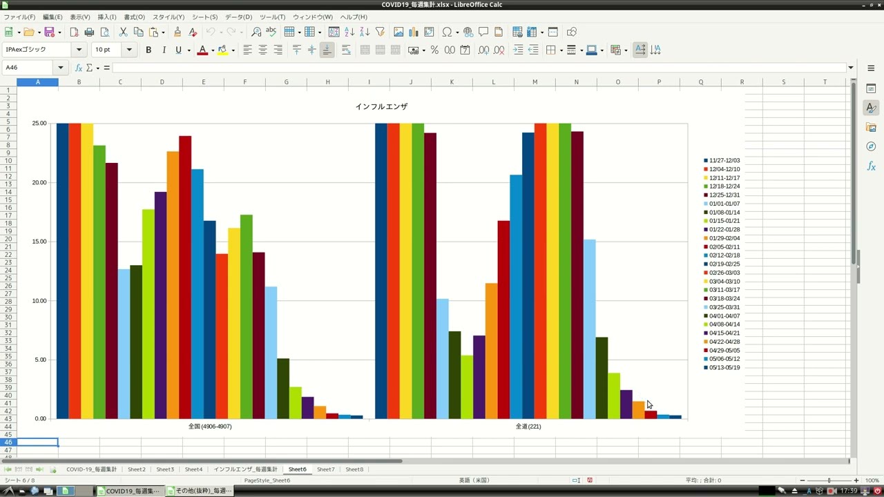はいえ5月13日から19日の結果が公表 されていたので表に追加しましたええ以前 から新型コロナと表現していたものは コビッド199というように名称をえ変更 と言いますか統一したいと思いますこれは 新しいコロナが発生した場合に新型コロナ の新 新新新型コロナという名称を使うわけにも いかずえ2019年から広がっていた コロナをcovid19と呼ぶことはもう え発表されていましたからこれに統一して また新たなコロナが発生した場合には そちらが新型コロナとなるようにこれまで のコロナをコビッド19に統一したいと 思います今回えまとめて言ってしまうと 全国北海道えどちらもですがえ インフルエンザは徐々に減ってい ます順調に減っていますがそれ以外のえ covid19及びコビッド19 インフルエンザ以外はええ全て増加してい ますしかも急激な上昇してるものもいくつ かありますのでどこが増えた減ったという 発表の仕方は今回しませんこれを見て もらうと分かるようにえ上昇を続けて 北海道もちょっと急激な上昇をしています だんだん皆さんの気が緩んできているのか え今後増え続ける傾向にあるようなので それは気をつけてもらいたいと思い ますえこんな感じですね少し減っ たのもあるんですがもう大多数が上昇 ばかりですまこれは北海道の場合ですけど もえインフルエンザ は大多数減っているんですがまポロポロ と上昇増加してるものもありますね えっとコビッド19とインフルエンザ以外 で言うとですね えRSウイルス感染症こちらはえ減って また増えてますねグラフで見るとちょっと 分かりにくいんですがえ全国平均 で 1.38と言うともうちょっと他のが 重なって分かりづらいんですがこのこの 辺りにあるはずですねま分からないんで えっと北海道の数値的に場所によっては ちょっと急激な上昇してるところもあり ますえ皆さん気をつけて くださいえイト結膜熱えっとこちらもえ 上昇を続けて ます えこちらも若ですね全国平均が0.71と なってますがこの辺りにあるようです え北海道のないな北海道内でも え場所によっては急激にゼロになったり いる場所もあったりしますが多くが急上昇 しているところがえありますえ英軍溶血性 連鎖給金英軍 レ英軍陽錬金ですかえっとこちらも ちょっとこれは急激な上昇してますねこれ も えっといくつになってんでしたっけ4.9 1全国平均4.914.91ですから5 近く えこの辺をこう変化してこ近くに上昇し てるんでしょうねでえ 北海道内でもこれの上昇急激な上昇がえ 多数の箇所で起きてます感染性1兆円 えっとこちらもえ [音楽] けてますでえ北海道内も急激な上昇を続け ているしているもがあります えっとこれも下がったかと思ったんですが 急激に増えたりしてますねこのオレンジの 線と かはいえ水筒だけは えまゴールデンウィークの間がちょっと 多かったのもあるんですが少し減ったよう にえ見えてしまいますがえ今後の動きは はっきりしないですかねえ全国平均は横倍 ぐらいまこれはちょっと今後増えるか減る かあまり分かりにくいところですねで えっと以前からえ見てきたヘルパンギーナ がえ今回 ちょっと急激に上昇してますえっとこれは 北海道内でも真原の発生ででえ全国平均の 青い四角こちらですねえ見やすいんです けども えーまゴールデンウィーク前後 から急激に増えていっ てる感じがありますこのまま上昇続ける 感じがありますねえマイコプラズマは えまあ0.1Xとこれはちょっと横倍から ちょっと増えるかもぐらいの変化ですね こちらも全国平均がえ見やすい線で現れて ますけどもえまだ減るとも言えない状況 増えるかもしれないという感じですねで 突発性発信ですがえっとこちらはえっと ゴールデンウィークあたり前後でえ0.3 いくつっていうゴールデンウィーク少し前 から同じような値を継続している横ばい 状態に見えますこれも増えるか減るか ちょっと分かりづらいところですね [拍手] えっと今回はインフルエンザは減ってい ますえそれ以外covid 19は明らかに上昇をしていてこちらの covid19とインフルエンザ 以外も え横ばい から急激な上昇 え今後減るだろうと予測されるものはない 状況に見て取れるということで え今日 の解説を終わりたいと思い ますで えっと見ていてあの あれ20周の先値書いてないなと思われた 方いるかもしれませんがえ申し訳ないん ですがちょっと私的個人的な都合なんです がえこちらの発表をえ今週で終了とさせて いただきますえ今後情報は知りたい方はえ ネット検索等で値を見てもらえるといいか なと思いますえ今回ちょっと短いんですが これでわいとさせてもらいます以上です