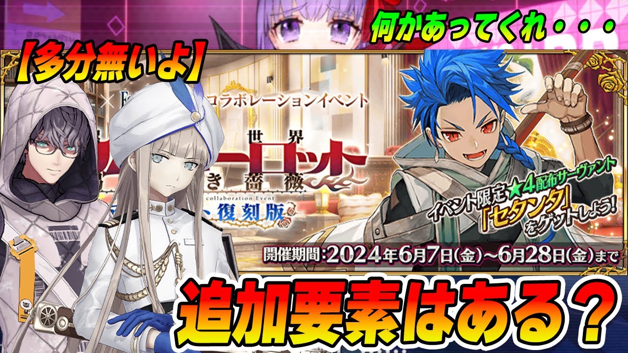 え宝箱イベントちょっと飽きてきたはい どうも攻略班ですえ本日はもうすぐという か今週の金曜日にアーケードコラボの復刻 が来るんですけどえそこで何か追加要素と かあったらいいなということでちょっと こういうのがあるんだったらここじゃない とかそういう話をしていこうかなと思い ますはいえタイトルサムネ色々書いてると 思いますがマジで多分何もありません何も ない確率がま 99.99%かなと多分甘草も言ってまし たそういった感じでちゃんとタイトルとか そういうところも配慮しているはずなん ですけどもう本当に中身全部妄想なんで あのなんか追加要素絶対来るってこと確定 確定みたいなみんなで期待しようぜみたい な内容では一切ありませんのでそこは ちょっとお許しいただければなと思います あの本当に来て欲しいななんかあって 欲しいなそういう話をしてるだけですので まず何も来ないんだろうなっていうのは 前提でそういう心構えで聞いていただけれ ばうん僕としても助かりますでなんで来 ない可能性が高いって思ってるのかと言う と今回の復刻イベントって元々前々から 復刻する予定で初回のコラボ時は出せ なかったけど復刻時はこれをやろうあれを やろうみたいなそういうのって今までの コラボはあったと思うんですけど最近って そもそも復刻をやるっていうのが消えまし たしで今回はアンケートでの復刻という ことでそもそも運営さんが復刻する予定が あったわけではないイベントですのでマジ でイレギュラーなんですよて考えると復刻 時にこれを出そうっていうのが仮に決まっ ていたとしてもアンケートの結果が出て から今回の復刻までに何か例えば新規 サーバントとかそういうところが間に合う かどうかっていうのはあの過去のFGOの イベントとかまそういうなんか開発の状況 とかを聞く限りまあないと思っていた方が いいのかなと思うのでうん個人的にはマジ でないよりではありますなんですけど ちょっとねま動画ネタがないとか言われて しまうともう何も言い返すことはできませ んが来たらいいよねとか配信中になんか あって欲しいよねマジで頼むからみたいな そういう感じね結構話していたんでまそれ の共有というか改めて追加あるんだったら これがいいなとかそういうとこお話しして いきますちょっとね前置き長くなっちゃっ たんですけど本題に参りましょうはいで まず一旦おさいなんですけどコラボ イベントの復刻時の追加要素についてお さいたまにこれあるんですけどというか 大体あります歴史で言うとからの教会 コラボ復刻時の朝富士の実装プリアコラボ の復刻でみゆが新たに実装みたいな感じで 復刻時に初会時にいなかった新規 サーヴァントを実装するというパターン これこれ過去結構ありました最近は そもそもコラボの復刻というか復刻 イベント自体もなくなっていたんで しばらくは見てなかったんですけど復刻時 に実装されたサーバントっていうのは 少なくありません今ねおそらく画面の右側 にいるキングプロテアこちらも色々あって 多分初会時に出そうと思っていたんだろう けど何かがあったのか復刻時の実装とに なってましたというか今動画撮影しながら アップメディは見てたんですけどこれ コラボイベントの復刻アポクリファコラボ 以会新規サーバント増えてますねで 2019年の事件簿コラボの復刻で フェイカーで2020年に開催された レクイMコラボ以降ってそもそも復刻が来 てないんで新規要素があるかどうかって いうのが未観測なんですよねということは アポコラボ以外ははい新規サーバント増え てますって聞くとちょっと期待したくなる し俺もちょっと期待したい気持ちが増えて きたんですけどただしさっきも言ったん ですけど今回はアンケートでの復刻という ねすごくイレギュラーな状況なんで復刻時 にはこのサーバントを追加しようみたいな 元々準備していたものとかは多分ないので うんやっぱりこういうところ話してて思い ますけどマジで今回ね追加要素っていうの はないと思っておいた方が平和だと思い ますでさっきは復刻時にサーバントが追加 っていうパターンだったんですけどえ最近 だとこの宝箱イベントでもありましたが フリークエストの難易度追加っていう ところは結構ありますえ今回は最新が90 プスの状態だったんですけどプラプラ初回 開催時以降は定番になってましたので今回 はプラプラが追加されてましたで復刻王は 初回時は90が最大だったんですけど復刻 時90プラスが追加復刻クリスマスの 2020サンタカレナのイベントでは プラプラが追加という感じでフリクエ追加 だけというパターンはうん今までも何個 前例がありますで他にもからの教会で高 難度が追加あとは事件簿コラボの復刻で フェイカーが実装された時はガチャの追加 だけじゃなくて偽典の期間っていう完全に 新規の追加ストーリーしかもめちゃくちゃ 面白い濃密なストーリーが裏パートとして 追加っていうパターンもあり