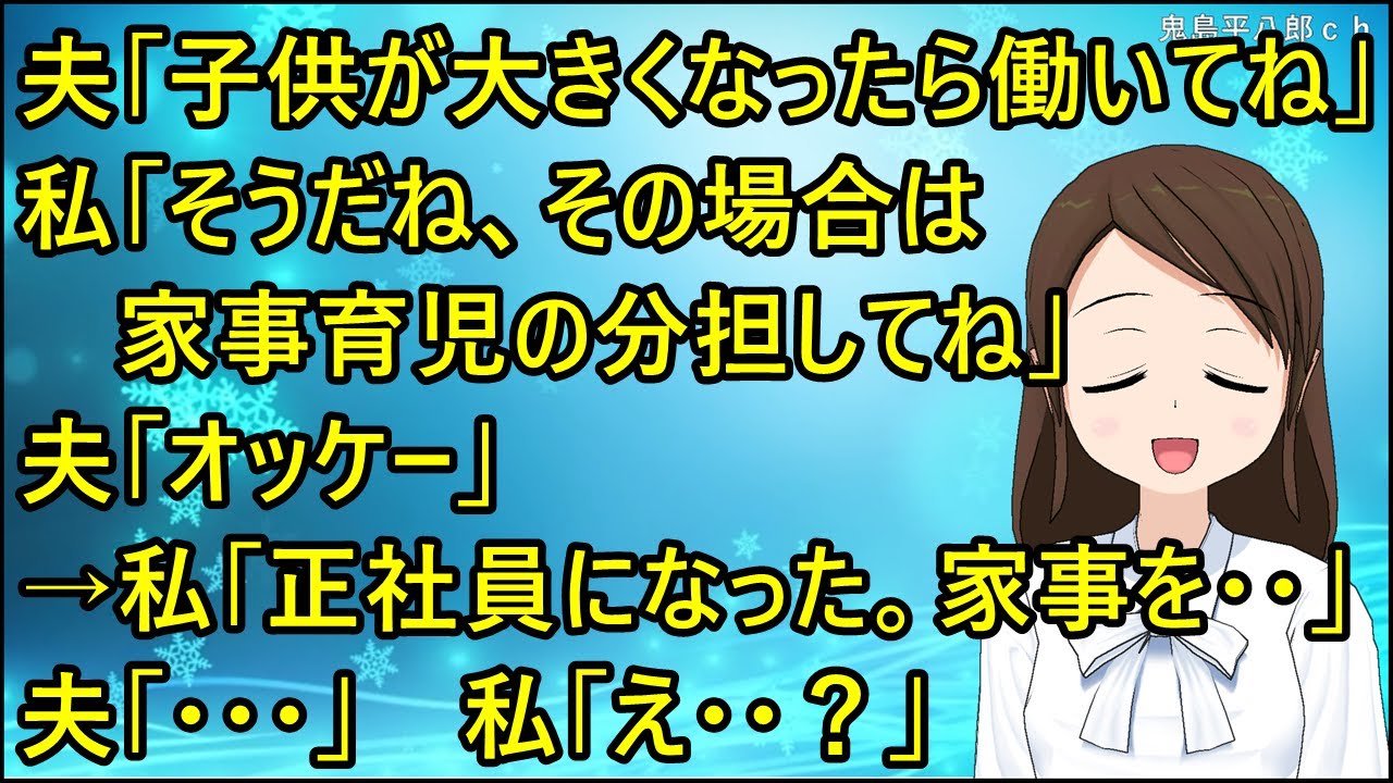 【スカッとする話】夫「子供が大きくなったら働いてね」私「そうだね、その場合は家事育児の分担してね」夫「オッケー」→私「正社員になった。家事を分担・・」夫「・・・」私「え・・?」