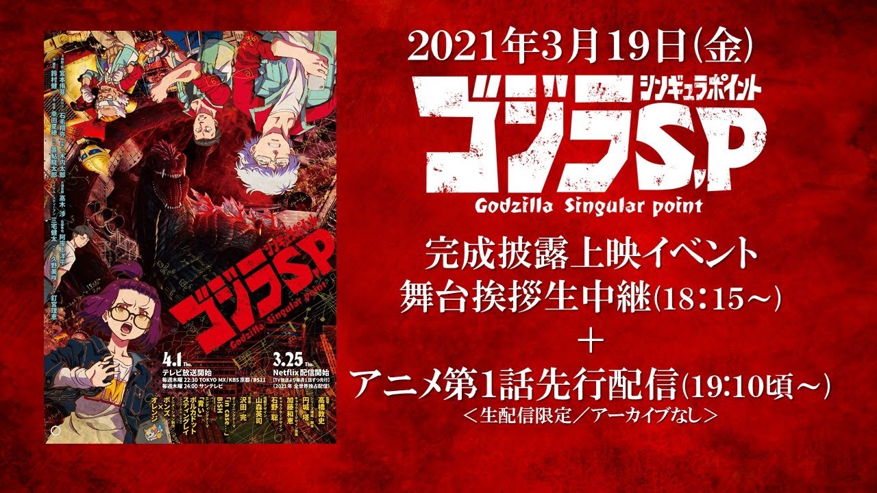 Share Facebook Twitter Pinterest LinkedIn 配信日時:3月19日(金)18:15~舞台挨拶生中継/19:10頃~アニメ第1話配信 【配信内容】 4月1日(木)テレビ放送開始&3月25日(木)Netflixにて配信開始のTVアニメ『#ゴジラSP』のメインキャスト+OPアーティストのBiSHが登壇する完成披露イベント舞台挨拶を生中継!さらにアニメ本編第1話を生配信限定で特別先行配信!※日本国内限定配信 ※アーカイブなし 【舞台挨拶登壇】宮本侑芽、石毛翔弥、久野美咲、釘宮理恵、高木渉、置鮎龍太郎、BiSH #アニメ #ゴジラ animeOPアニメゴジラS.P<シンギュラポイント>ソング君の名は恋愛感動映画