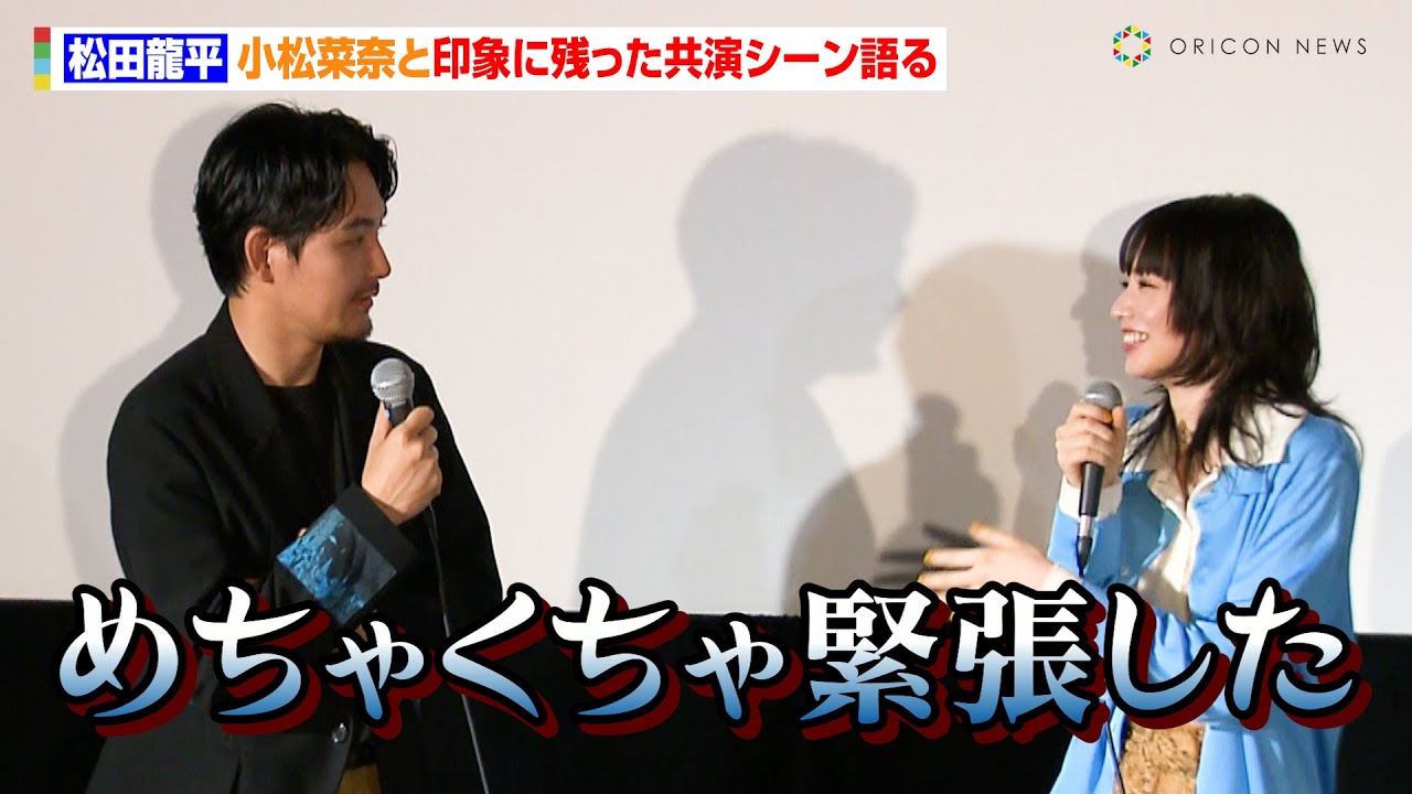 でちょっとまたえっと小松さんと松田さん に伺えればと思うんですけどもあのお2人 の共演シーンがすごく多い作品だとは思い ますけどもま印象に残った共演シ等々 ございますでしょうかもう皆さんご覧に なってるのであのネタバレ等々気にせず 伺えればと思い ますじゃあ松さんからごよろしいでしょう かはいえ私はとバイクのシーンがいいなっ て思っていてなんかあそこのシーンは唯一 こう青と緑がなんかこう生きてる感じが するところで喋ってはないんですけどと なんかこう寄り添ってる2人のこう姿が なんか雰囲気とかも含めすごいいいなと 思っていてなんかあの龍平さんがすごい バイクが好きっていうことでなんかあの 現場の中で一番生き生きしてた瞬間でした すごい楽しそうでしたもん本当ですかはい めちゃめちゃ久々に乗ったんですよでもあ そうだからなんか あの死なないようにしなきゃと思ったん ですよねあと落ちないようにいやだ緊 めちゃめちゃ緊張してましたしてましたね あの俺1人だったら良かったんですけど 久々で2人乗りだったんで結構 プレッシャーでかいなと思ってそうはい 意外とですねそのバイクのシーの ファーストテークはですね緊張したと松田 さんおっしゃいましたけど1番最初の カットはですねテイクは松田さんニコニコ してたん であのあ楽しんでるなとは逆に使えない みたい使えなみたいな感じですけどすはい そんなこともありましたすいません全然 全然松田さんもこう印象に残った共演シー ンってはあの今のバイクのところになり ますああまあそこはもうラストの方でなん かすごい気持ちいいなと思ってうんやっぱ エンディングに向かってってる感じとうん 物語りとしてはもう2人の距離ってのは もう最初から最後まであんま変わらない 距離感でずっといるけどうんまあなんか デートしたり色々あのまでもそれでも なんかあんまり変わらないイメージって いうかうん発展していかないのがあの やっぱ死の世界なのかなっていうかあの そういうイメージがあっ てやっぱり その生きてた時のシーンがまワンシーン だけあってあの真重するシーンなんです けどでそこの撮影時に結構生き生きいた方 がなんかあの死に対してもっとこう衝撃的 というかその心が動いてる2人っていうイ を持ってた方がいいのかなと思ってたん ですけどま最終的にま手をつ繋ぐっていう ぐらいの動作であのその真の世界にいる時 はま手も繋がないしなんか一定の距離感を ずっと保ってるっていうイメージだった からなんかそのただそれだけの手をつぐっ ていうあのそれだけの行為ですごくこう なんか別の世界というか生きているんだ なっていう感じがしてすごい印象的だった というのもあるしうんあとやっぱ金山かな 金山が今回そのこの映画の中ですごい出て くるんです けどなからま金座もそうだしなんか いろんなそのロケッチが実続きになってて どう繋がってんのかなってこう想像する ようなあ急にねあの草の中から出てきたり とかうんうんなんかそのそこがでもその 繋が妙に繋がってる感じがしてすごい 面白いなと思ったんですけどうん