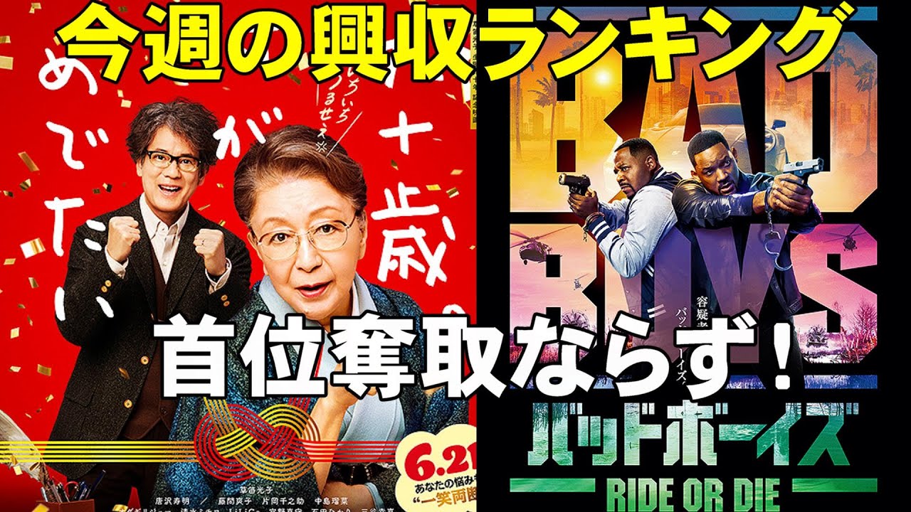 [音楽] [拍手] どうも皆さんこんにちはミステリー作家の 7です俺的映画速報第274回えオテ映画 速攻では今週の映画工業収入同員数 ランキングを見ながらエンタメのトレンド について語っていきますということでえ6 月21日から23日までの国内映画工業 収入同数ランキングが工業通信者より発表 されましてえ今週はねこんな感じになっ てるんですねはい周囲がねちょっと動いて ますねえ新作もえアンド345とえ全部で ねえ5作品ですね間違いないよねアンバ3 445そうだね5作品ですねというわけで 結構ねえ圏内入れ替わっているみたいな 感じではあるんですけどもえ周囲が動き ませんでしたねということではいこのデア ファミリーが週末3日間で動員1万9 600人え公州1億9700円を上げて2 週連続1位に輝きましたということでいや すごいですねえ累計成績は動員46万円人 え公衆が6億3900円となっていますと いうことでいやこれ結構口コミまあの 泣けるね本当にこのただ泣けるだけじゃ ないあのお涙頂戴だけにとまらないえ人間 ドラマヒューマンドラマだったんですよね あのまあねま僕としてはねもう泣かされる 徹底的な美談でまシリアシリアスさのない シニカルさのないえ美談という感じでは あったんですけどもまあ日本映画はねえ こんな感じでいいんじゃないかなと思う ぐらいのえーま本当に飛弾中の飛弾なん ですけどもただそれだけにはとまらないえ サムシングエルスと言いますかがありまし てこれはね非常に僕もいい映画だなと思っ てますこ評価もねえ確か高評価したと思う んですけどもまそんなわけでね口コミで きっと広まってるんですかねこの映画この 映画いいよっていう口コミが広まっている せいかえ1位をねキープしているという ことでこれこのペースでいくとどうだろう 10億円ぐらいはきそうですよねもう ちょっとこう火がつけば15億円とかねま 今後うん今いい感じで火がつきそうつき そうな感じではあるんですけど実際つくか どうかがねわかんないこれが工業の難しい とこなんですよねまこっからじわじわ じわじわえドイスを伸ばしていくっていう ことは十分に考えられるしえそれだけの ポテンシャルを持っている映画だと思うの でえ今後もねちょっと記録の方がえ気に なるとこではありますねさあ来週も周囲 守れるのかどうかですよねままだ見てない 方はですねえなんかねこれ予告編を見ると あいかにも涙ちょだいものみたいな日本 映画でよくありがちな強引に泣かしてくる お涙ちょだいものみたいなイメージだと 思うんですけどま実際ねそうではあるんだ けどもでもねそれだけにはとまらない やっぱりねあのやっぱりいい映画なんです よねすごくえなんかこう潜入感で見ないの はちょっともったいないのかなっていう ことでえーまお勧めはできる映画ですねと いうことでえ今週1位デアファミリーがね え周囲を守ったっていうのはま個人的には 納得というか嬉しいというかうんでもね2 位がこれなんですよね90歳何がめでたい なんですよえ昨年100歳を迎えた直木し 作家の直よじゃなくて佐藤愛子のベスト セラーS集をえ草笛みつ子主演で映画化し た90歳何がめでたいえ初日から3日間で 動員11万18000人公衆1億4800 円を記録しましたということでねえこちら は僕の動画でももうすでにレビューして いるんですけどこれもおすめですねうん あーディアファミリーね確かにいいんだ けどやっぱりねえ家族若い女の子が苦しい 思いをしてね苦しい思いをするっていう 内容なんで重いっちゃ重いんですけどこの 90歳何がめでたいは本当に新息楽しめ ますハッピーでえ通であのなかなかね 面白いあの世代問わずこれは誰が見ても 楽しめるんじゃないかなと思いますねま おそらくね観客層は年配層の方が多いと 思うんですよえ僕これねあの東方シネマズ 浜松のレイトショで見てきたんですけどえ お客さんは僕1人だけでしたうんま おそらくえ年配層がね視聴もほとんどが 年配層なんでレイト賞はねやっぱりお 年寄りはあまり来ないですからねで あんまり若い人はいないのかなうん最近ね いくら浜松でもレイトシで1人切 りっていうのはなかなかないですからねま たまにありますけどもえ2位でしょ工業 収入ねどあの動員ランキングで2位なのに 1人ってことはねまよっぽどか若者若い人 たちが見に行ってないんだろうなっていう のはまちょっとねまこう推できるわけなん ですけどもでもねこれね本当面白いですよ リアファミリーとこの90歳どっちがお すめかって言ったらね僕はやっぱり90歳 の方がえ無難に楽しめるんじゃないかなと 思いますディアファミリーもねすごくいい んですけどえちょっと重いよねはいえー次 第3位えこちらバッドボーイズライドオア ダということでウィルスミスとマーティン ローレンス主演のバディアクション第4弾 えバッドボーイズライド題初日から3日間 の成績は動員10万人え講習1億5400 円となりましたということですねえこちら ですね昨日僕動画あげてますので是非 チェッ