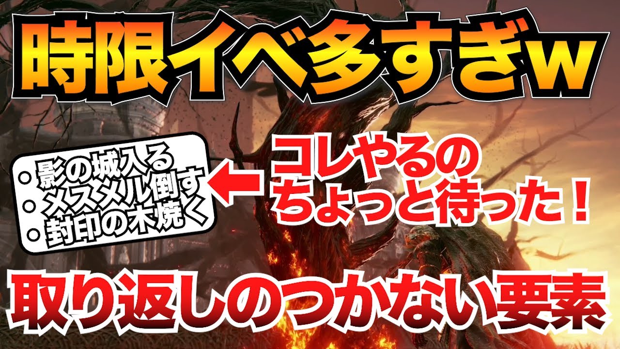 はいどうもこんにちはワイトです今回は エルデンリングDLCの取り返しのつか ない要素をまとめということでえ1度やっ てしまうとその週では取り返しがつかなく なる要素について解説していきますまほぼ NPCイベント関連ですねま本作は本編 以上にフラグ管理が難しくてえ次元 イベントも多いので知らずにストーリーを 進めちゃうとほとんどのイベントが完My できなくなってしまいます今日紹介する 内容を事前に把握しておきなるべく1周で 多くのイベントを行しましょうえ とりあえず注意しておくべき点の一覧だけ 先に表示いたしますえーこれらは全て 取り返しがつかなくなるので注意し ましょう後悔したくない方は是非最後まで 見ていってくださいでは具体的に何に気を つければいいのかどの時点で何をやって おけばいいのかなどを具体的に解説して いきますまずはは影の城に入るですえ影の 城っていうのは初期位置からずっと北東に あるこの城ですえストリー上必ず通る場所 ではあるんですがここに入った時点で一部 のNPCイベントが進行負荷になりますえ 確認できてるのはこの2人のイベントです えま詳しいイベント解説はちょっとこの 動画内ではできないんですがとりあえず影 の城に入るまでにこれらのことはやって おき ましょうまず門人との会話門人はサンサの 十字と街道の十字にいますヒントアイテム ももらえるのでえ影の城に入る前に必ず 話しかけておきましょうえそして同時に 門人にさり煮込みを渡すまこっちはそこ まで重要ではないんですが一応やっておき ましょうさり煮込みはベルラの倉庫にいる 門人の老婆からもらえます四撃破で もらえるの頭を装備してえ老婆と話した後 ロードを挟んでからもう1回話すともらえ ますでサ煮込みを門人に渡すとえ素材 アイテム少路の面がもらえますえこの イベントは影の城到達後ではできなくなる ので注意ですえ続いてこの3つは流産の 巫女関連のイベントですまず正門前の十字 でムーアと桂坂の十字でティエリアと話し た後にえムーアから黒シロップをもらい ましょうでシロップをティエリに渡して 生きることに疲れたを選択すると規約が もらえます飛躍は流産の巫女イベントで 使うアイテムでえ影の白到達前に手に入れ ないとおそらく入手不可になりますはいえ これらのイベントは影の城に入る前に必ず やっておきましょうただこれら以外にも影 の城到達でフラグが折れるイベントあるか もしれませんえ正門前の十字やサンサの 十字街道の十字などえNPCが多くいるの でできるだけ話したりしてイベントを進め ておいた方がいいです続いての取り返しの つかない要素はメスメルを倒すです メスメリックしなくなる可能性があります え具体的にはこれらのイベントをやって おきましょうえーまず影の城に到達したら メスを倒す前にレダと門人と話しておき ましょう街道の十字にいますえ会話が進ま ない場合はファストトラベルなどでロード を挟むといいですえ最終的に会話がループ するようになればオッケーでその後影の城 でレダと門人の共闘敵対祭イベントも こなしておきましょうこのイベントはメス メル線が終わると消失してしまいますえ イベントの場所は正門広場から右の ショートカットの門をくぐっ てえ坂を登っ てすぐ右ですここに召喚サインがあるので えレダと共闘するか門人と共闘するか選び ましょうちなみにここで門人と協力すると メスメル線のエリアで金査イが出現して 門人を呼べるようになりますで一緒にメス メルを倒した場合はえその場で門人と 話せるらしいですまですが必須のイベント ではないのでそこまではやらなくても 大丈夫とにかく召喚サインのイベントえ これはこなしておきましょうでえメスメル 戦前にやっておきたいもう1つが門人の ローバとのイベントですこれは先ほど紹介 したえサリ煮込みをもらうイベントまで 進めていれば大丈夫ですえもしねローバと のイベントを一切進めずにメスメルを倒し ちゃうとえローバとを話せなくなるので 最初の神獣の頭を装備して話しかけ るっていうところまではえ必ずやっておき ましょう続いての取り返しのつかない ポイントは封印の木を燃やすですえこれは マップ北星のつぼみの教会でえボスロミナ を倒した後のストーリーとなりますここで 封印の木を焼くとえほとんどのNPC イベントが進行不になるので必ず全ての イベントを終わらせてから行いましょう ここはね本当に1番注意ですで進行負荷に なる該当のNPCは こちら一応ちゃんとイベントが終わらせ られているかの目安ですがえレダはですね 敵対して倒しているかえもしくは共闘した 後に街道の十字でタリスマンをもらえて いればオッケーですえ門人は影の城での サインもしくはつぼみの教会正門前での 侵入でえ倒していると思いますでもし倒せ ていないっていう場合もおそらくラストで 最低限の報酬はもらえるのでそのままで オオですえフレイヤは保管庫7階で手紙を 渡していればオで