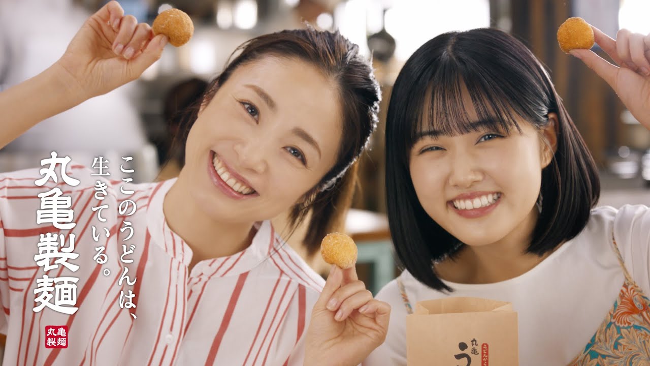 新TVCM丸亀製麺「二つの味だよ!丸亀うどーなつ」篇では、6月25日(火)から全国の丸亀製麺にて発売開始となる、うどん生まれ※の「丸亀うどーなつ」を俳優の上戸 彩さんと原 菜乃華さんが幸せそうに頬張る姿をお届けします。今回のTVCMで初共演となるおふたりが、「丸亀うどーなつ」のもっちもちな食感におどろき、感動する表情にご注目ください。