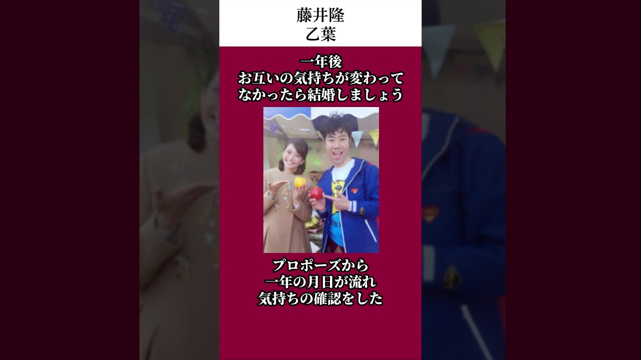 藤井孝市は謙虚な音葉に惚れたという スタッフが公所から証明機器を落として しまい下に座っていた音葉に当たりそうに なった謝罪に来たスタッフに音葉は言った 邪魔になるところに座っていた私が悪い ですわざわざありがとうございます藤井は 思ったこんなに人気なのに天狗にもなら ないなんて素敵な人だな音葉も藤の紳士的 な対応に前から惚れており2人は両思い だったそうだ藤井は言った1年後お互いの 気持ちが変わってなかったら結婚し ましょうプロポーズから1年の月日が流れ 気持ちの確認をした私の気持ちは変わって いませんそれを聞き藤井は言った僕は 気持ちが変わってしまいました僕は1年前 よりももっとあなたが好きになってしまい ました数年後このプロポーズについて藤井 に聞くと藤井は答えたそんなかっこいい僕 が言えるはずないじゃないですか