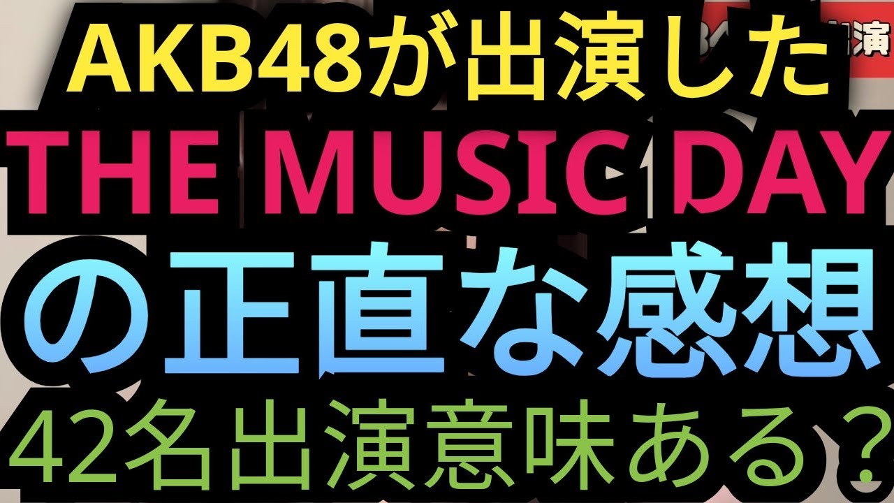 日テレのザミュージックを見ました正直な 感想を言うとめっちゃ期待していたのに なんか片しを食らった感じ42名もAKB メンバーが出演していたのに実際テレビに 移っていたのは10名ほど19期のサリー はばっちり映っていましたあと千葉さんあ みゆとかかなうんなぜ今更ポニーテールと 趣旨なのか夏を意識したのかなテレビ局の 要望っぽいけどAKBサイドからこの曲を やりますとか言えなかったのか色々不満は ありますがちょっと映る時間が短 すぎもっとねカミンとか地上波で見れるか 楽しみにしてたんだけどどこに移ってたか 判決不能だった番組もさ8時間もあるんだ からAKBにもっと出演時間確保してあげ てようって思う