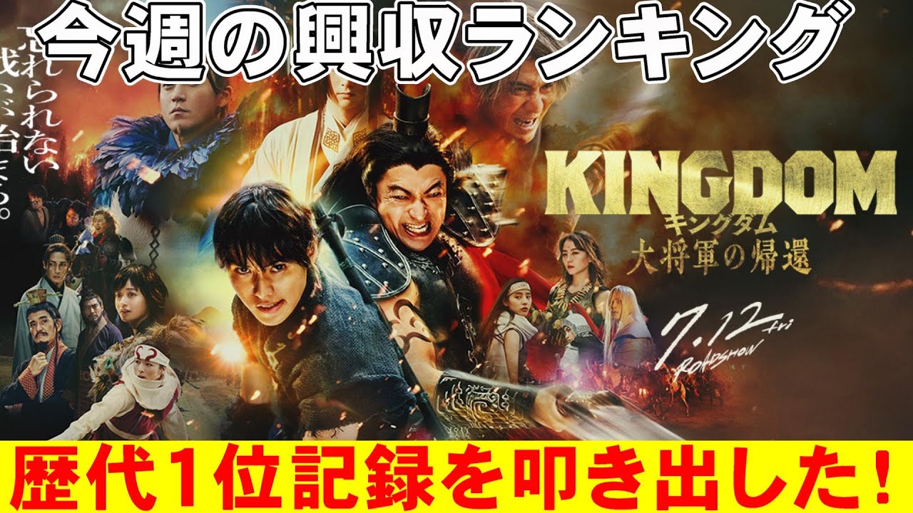 [音楽] [拍手] どうも皆さんこんにちはミステリー作家の 七尾よしですオテ映画速報第277回オテ 映画速報では今週の映画工業収入同員数 ランキングを見ながらエンタメのトレンド について語っていきますということでえ7 月12日から14日の国内映画工業収入 動員数ランキングは工業通信者より発表さ れましたということではい今週はこんな 感じになってるんだけどま周囲もねえ 入れ替わって動いてますねで新作が えっと今回新作は1一作だけなんだけど その新作が圧倒的でしたねはいもうこれは もう皆さんねえ予想通りのもうもう皆さん 納得予想通りのえ第1位でございます キングダム大将軍の期間ということで えっとこちらですねすごいですよなんかね 僕あのこれ金曜日公開初日にあの見に行た ですよ東マズ渋谷にでま初日ってことも あって平日ってこともあってお昼ぐらい だったんですけどなんかねそんなに言う ほど入ってないというま入ってますよ他の 映画なんかずっと入ってるけどそれでも どうだろううん半分7割とかいや半分 ぐらい7割埋まってんのかななんかね なんかそんなにこうたくさん入ってるって 感じで前の席なんかもガラガラでしたから ねだからなんかそんなに入ってるって感じ ではなかったので前作よりは工業種に 落ちるか同員数落ちるかなと思っていたら これが実は大間違いでいいですかこれ初日 から3日間で動員なんと106万5000 人公衆16億2900円を上げましたはい よく覚えていてください16億 2900円ですはいこれねどういう記録 数字かと言いますとえこちらねえ ウキペディアよりちょっとね えっとデータを借りしているんですけど えっとねオープニング講習これだ えっとオープニング講習これですね2日間 だこれ違うこっちごめんなさい3日間のね え近道日のオープニング講習ちょっと見 にくいかなこれちょっと拡大しますね えっと見にくいねこれガンガンガンとはい 拡大しましょうはい見てください16 29万円なんですけどまだねこれね 2024年4月現在なんで反映されてない んですよこれがねえ日本のえま日本映画 市場におけるえ歴代オープニングえ近同日 のオープニング講習なんですね1位がもう 当然皆さんご存知鬼の刃でなんと2位はね あの名探偵コナの100万ドルの道シルベ なんですがえっと今回このねキングダムが 16億2900円なんですよなのでえ ずっとここ辺2900円だから君たちは どう生きるか超えてますねえ天気の子に 及ばずですねなんで歴代17位ですね すごいね歴代17位なんですよちなみに この歴代17位という記録はねこれずっと ざっ見るとよく分かるんですけどこれは 日本映画における実写日本の実写映画の 歴代1位になりますこれより上はねあの 全部アニメかもしくは洋画なんですね パイレーツオブカリビアンとか穴とかま あとはもアニメアニメアニメですよねうん だから今回のこのキングダムのえ大将軍の 期間がですえ大将軍の期間がえ今までの 日本映画における実写映画実写映画部門の 第1位ね今まではねずっとね えっと劇場版コードブルードクターヘリー だったんですねこれがオープニング講習の 実写場の1位を守ってたんですけどはい 2018年ですからね6年前この6年間 ずっと守ってた記録をえついにキングダム が破ったということになりますはいという ことは逆に今までのキングダムがこの コードブルーを破ることもできなかっ たってことなんですねそうなんだでコード ブルすごかったんだね僕コードブル見て ないんでちょっと分かんないんです けどでちなみにですね月曜日の祝日そう3 連休でしたからね月曜日の祝日を含む公開 4日間では動員146人公衆がなんと 22億円を突破していてえ最終講習56 6億円を上げた昨年公開のキングダム運命 の炎との講習退避でなんと 181.1%を記録しているということ ですすごいですねシリーズ史上ナンバー1 のみならず法が実写歴代1位の オープニング記録を叩き出しましたという ことでいやこれはすごいえこの調子でいく と前回がねえ 56億ですから108それの作品その映画 のえこうオープニングの 181.1%っってことは8割ぐらいえ 上回ったってことですからね80%増し8 割増しですからねすごいですよ56 に対してこれ 70億とか行くんじゃないすかねうまく いけば これねえ70億とか 80億ぐらいいっちゃいそう なまスタートダッシュがねすごくても後々 しりつぼみになれば えま下がっていくわけですけどもまあの巷 の評判も非常にいいのいいしこれからから 夏休みを迎えますからさらにねドイスを 増やしていくでしょうからこれ は100億とか行くのか なまあ2倍で前回前作の2倍で 11200ですから8割増しだともう ちょっとね勢いがないといきませんが 80億ぐらいはちょっといけそうな雰囲気 ありますよね すごいなあでキングダムまたさらに新作が 作られるんですってねまた三部作次の シリーズに続くそうですよそりゃそうだよ ねこんな工業収入上げちゃったらそりは次 作らないわけにいかないもんね山崎ケト さんたち大変だなま大阪高尾さんはね