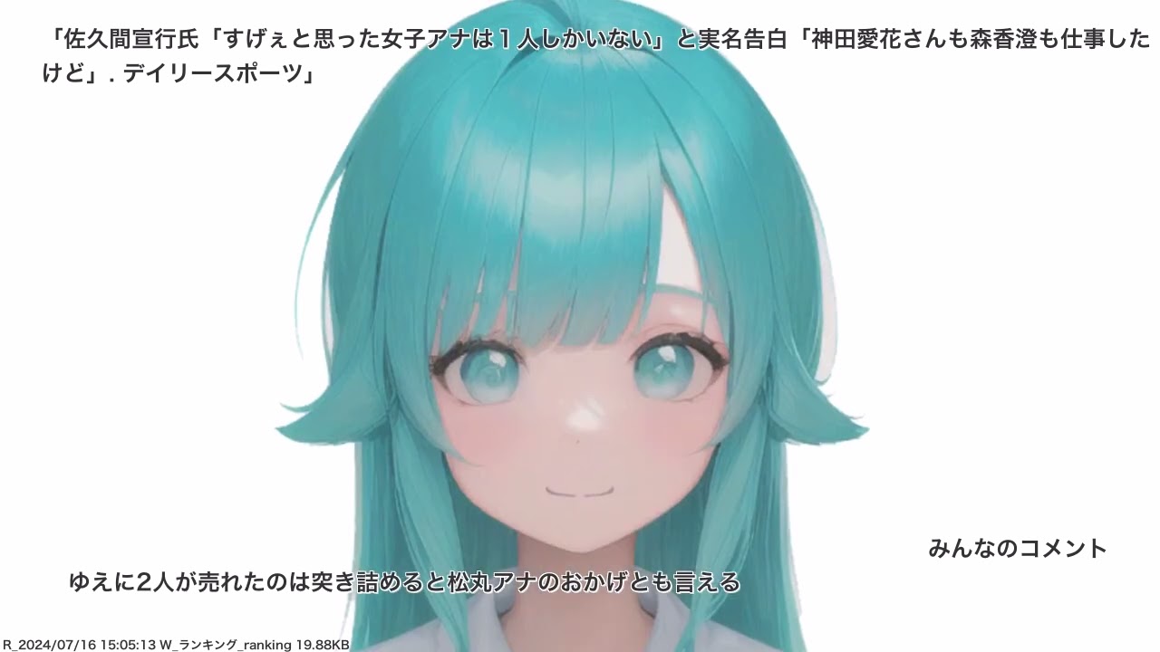 Share Facebook Twitter Pinterest LinkedIn 佐久間宣行氏「すげぇと思った女子アナは1人しかいない」と実名告白「神田愛花さんも森香澄も仕事したけど」. デイリースポーツ、その他 ニュース みんなの反応 などをVTuberがお届けします。 celebrity新井恵理那