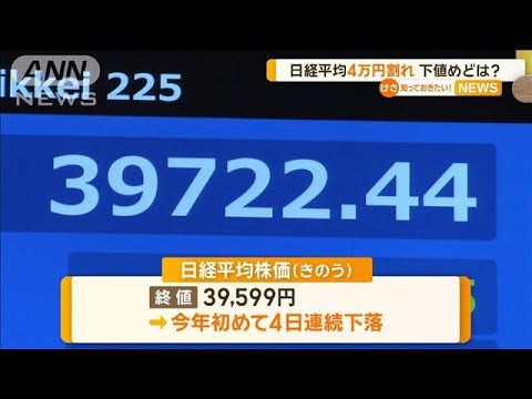 22日の日経平均株価は、終値で4万円の大台を割り込み、およそ1カ月ぶりの安値となりました。4日続けての下落は、今年初めてです。