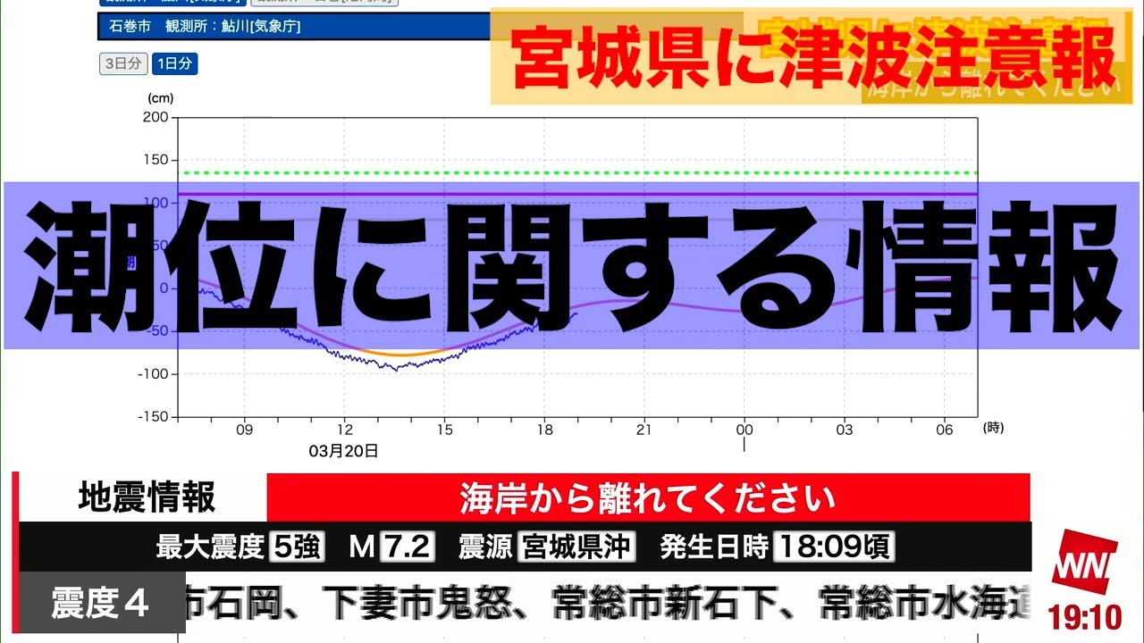 この地震によって津波注意報が宮城県沿岸に発表されています。ただちに海岸付近からは離れて、高いところに避難するようにしてください。