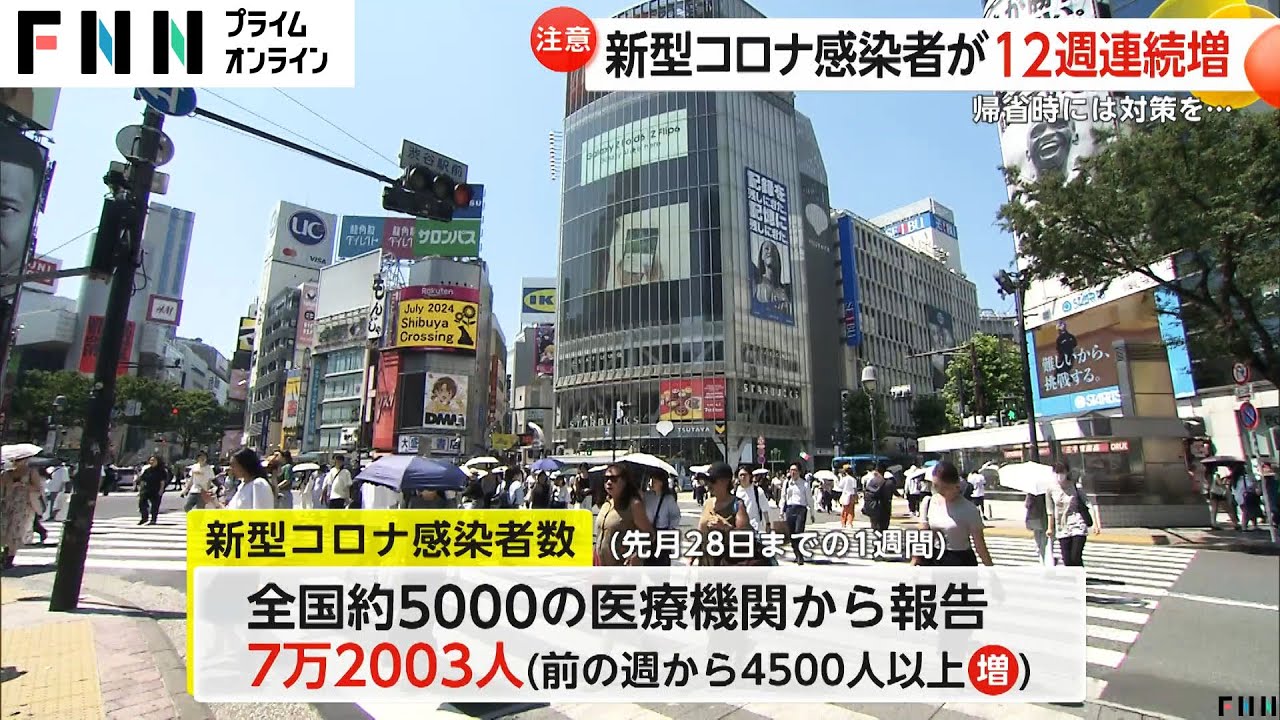 厚生労働省によりますと、7月28日までの1週間に、全国約5000の医療機関から報告された新型コロナの感染者数は、前の週から4500人以上増えて、7万2003人でした。