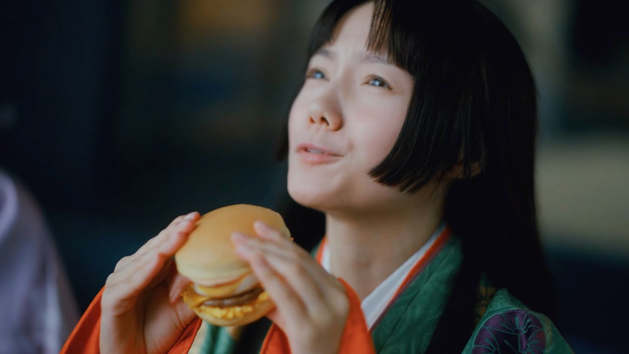 9月3日から放映する新TVCMは、宮﨑あおいがかぐや姫役、松重豊が翁(おきな)役、手塚理美が媼(おうな)役として登場。月見の季節に月から地球に帰ってきたかぐや姫が翁、媼と「月見バーガー」を一緒に味わい楽しむ様子を、絢香が歌う楽曲「三日月」にのせ、ユーモアがありながらもどこかエモーショナルな気持ちになるこの時期にピッタリの内容となっている。