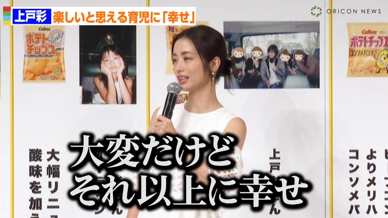 イベントでは『ポテトチップス コンソメパンチ』の略歴とともに、上戸の生まれた時からの略歴も紹介された。2人の子どもとの写真を紹介され「(育児は)大変ですけど、それ以上に幸せだなと感じることがたくさんあります」と感慨深く語る。