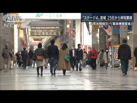 県はすでに、独自の緊急事態宣言を発出していて、25日から来月11日まで、仙台市内の酒類を提供する飲食店などに対し、午後9時までの時短営業を求めます。すべての期間で要請に応じた場合、1店舗あたり一日4万円の協力金が支払われます。