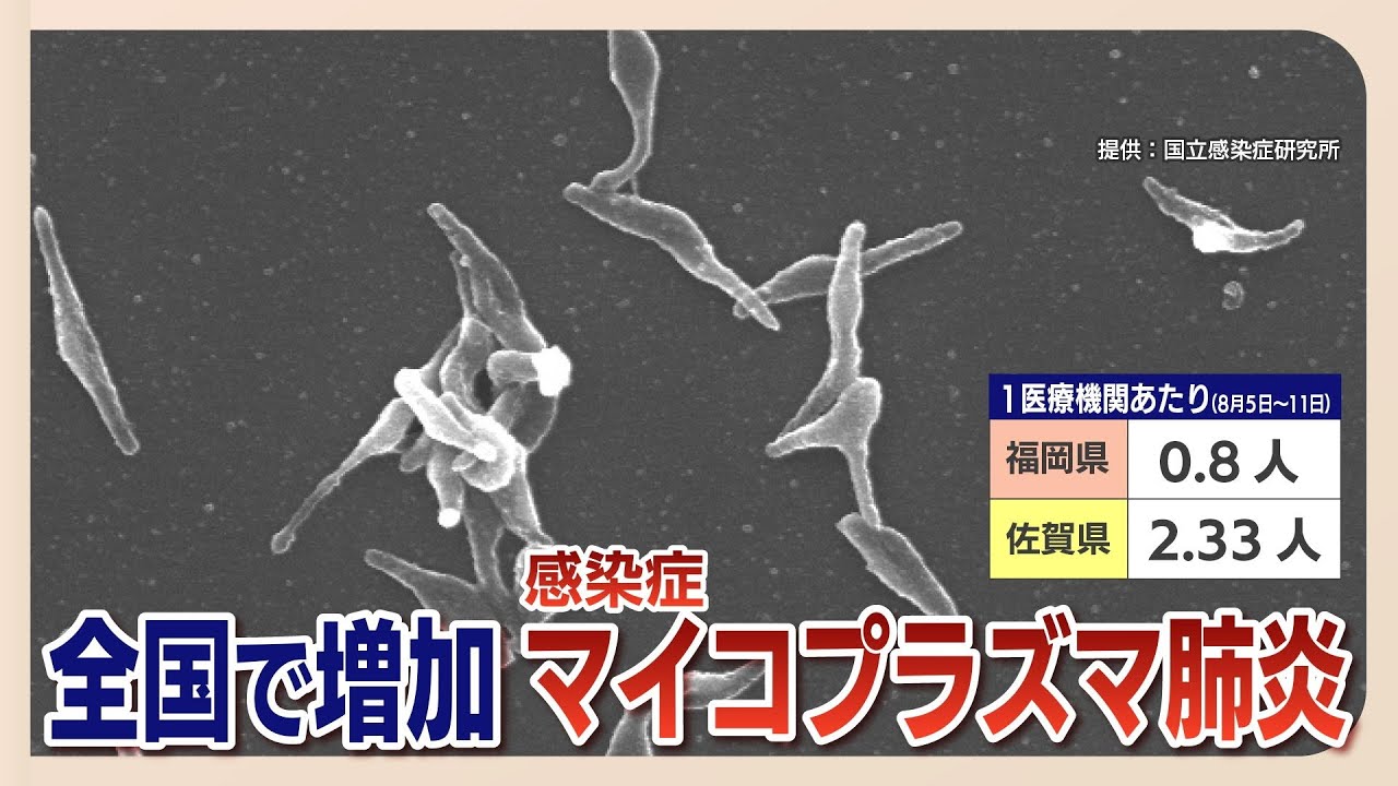 全国的に増加しているのが、「マイコプラズマ肺炎」。6月ごろから北部九州地区でも徐々に増えてきました。8月11日までの1週間、福岡の定点当たりの報告数は0.8人で、福岡では7年ぶりの高水準。佐賀県は2.33人と全国で最も高い数値となっています。