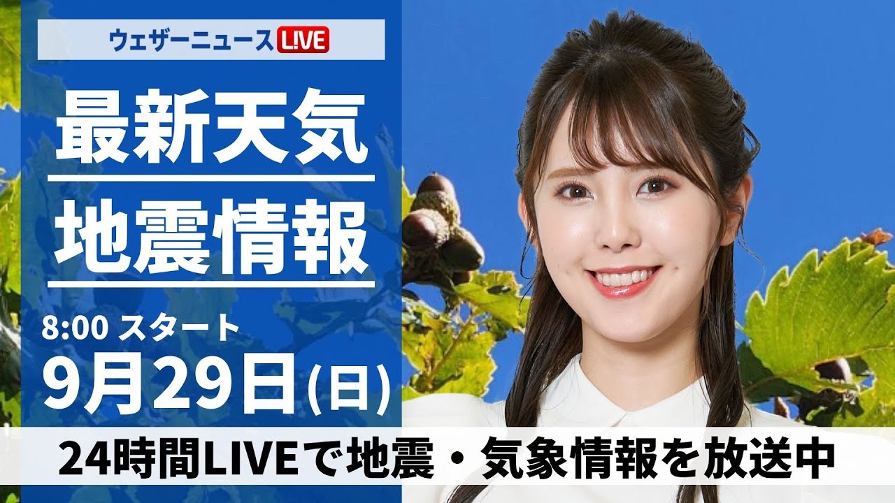 【ライブ】最新天気ニュース・地震情報 2024年9月29日(日)/近畿から東北南部は曇り空 関東は雨が降りやすい〈ウェザーニュースLiVEサンシャイン・小川 千奈/山口 剛央〉