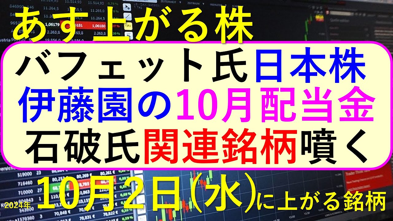 あす上がる株 2024年10月2日(水)に上がる銘柄。バフェット氏が日本株購入の動き。石破氏関連銘柄の防衛株などが急騰。伊藤園の10月配当~最新の日本株情報。高配当株の株価やデイトレ情報も~