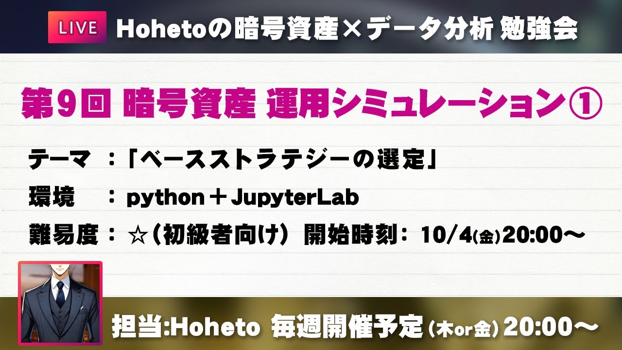 Hoheto勉強会では、暗号資産での資産形成を行うために値動き分析・取引戦略開発・ボットプログラム構築などを扱っていきます。