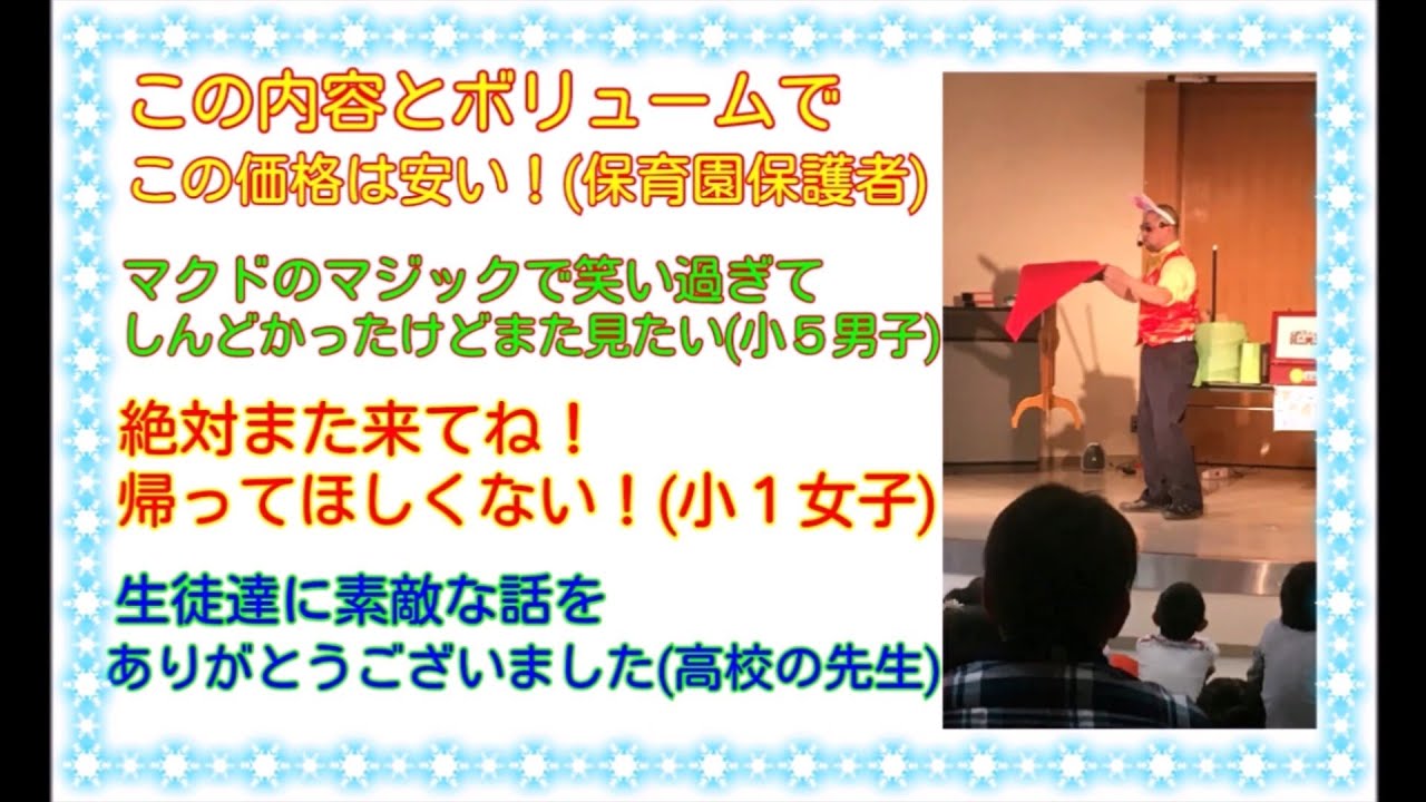 子供会・幼稚園・保育園・芸術鑑賞会・学園祭・クリスマス会など子供向けのショー。