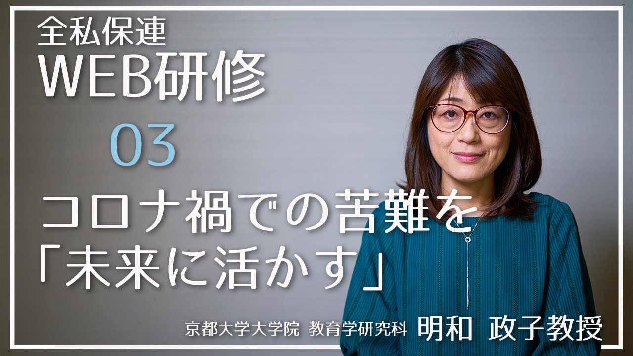 今回は京都大学大学院 教育学研究科 教授 明和政子先生を講師にお迎えし、「新たな生活様式と保育実践」をテーマにweb研修動画を配信いたします。今回は3本の動画から構成されています。それぞれのテーマは「コロナ禍のヒトの育ち」、「コロナ禍のいまこそ『ともに』生きよう」、「コロナ禍での苦難を未来に活かす」となっています。