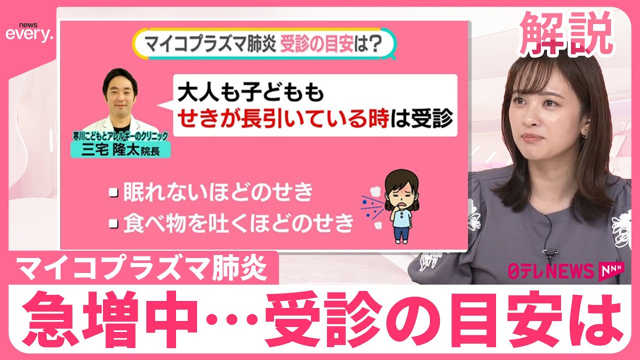 「『寒川こどもとアレルギーのクリニック』の三宅隆太院長によると、マイコプラズマ肺炎とは、細菌に感染することで起きる呼吸器感染症のことです。発熱やけん怠感、頭痛などから始まり、数日して乾いたせきが出始めます」