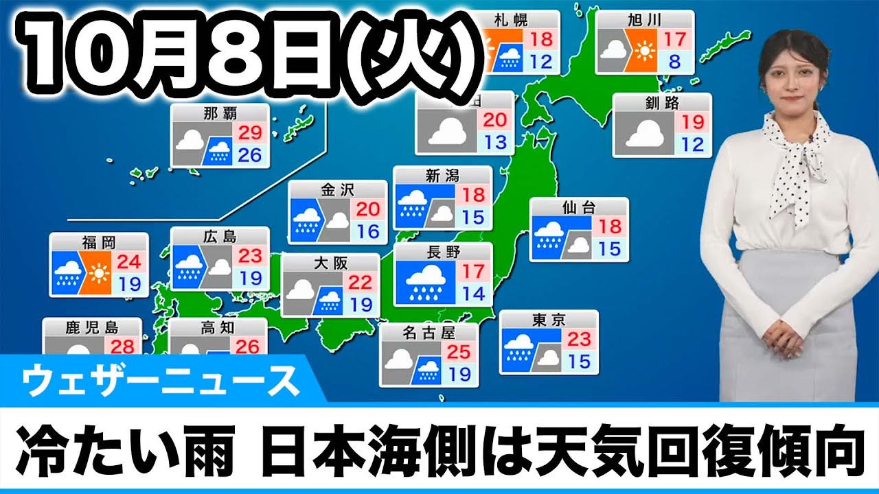 10月8日(火)の天気予報 関東は冷たい雨の一日に 日本海側は天気回復傾向