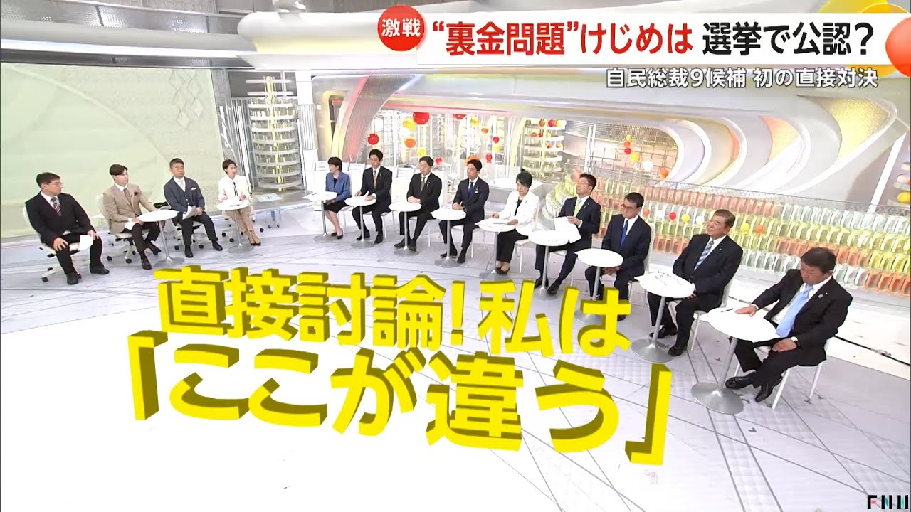12日放送のフジテレビの報道番組「イット!」にはこの9人の候補者全員が生出演し、初めての直接対決に臨んだ。