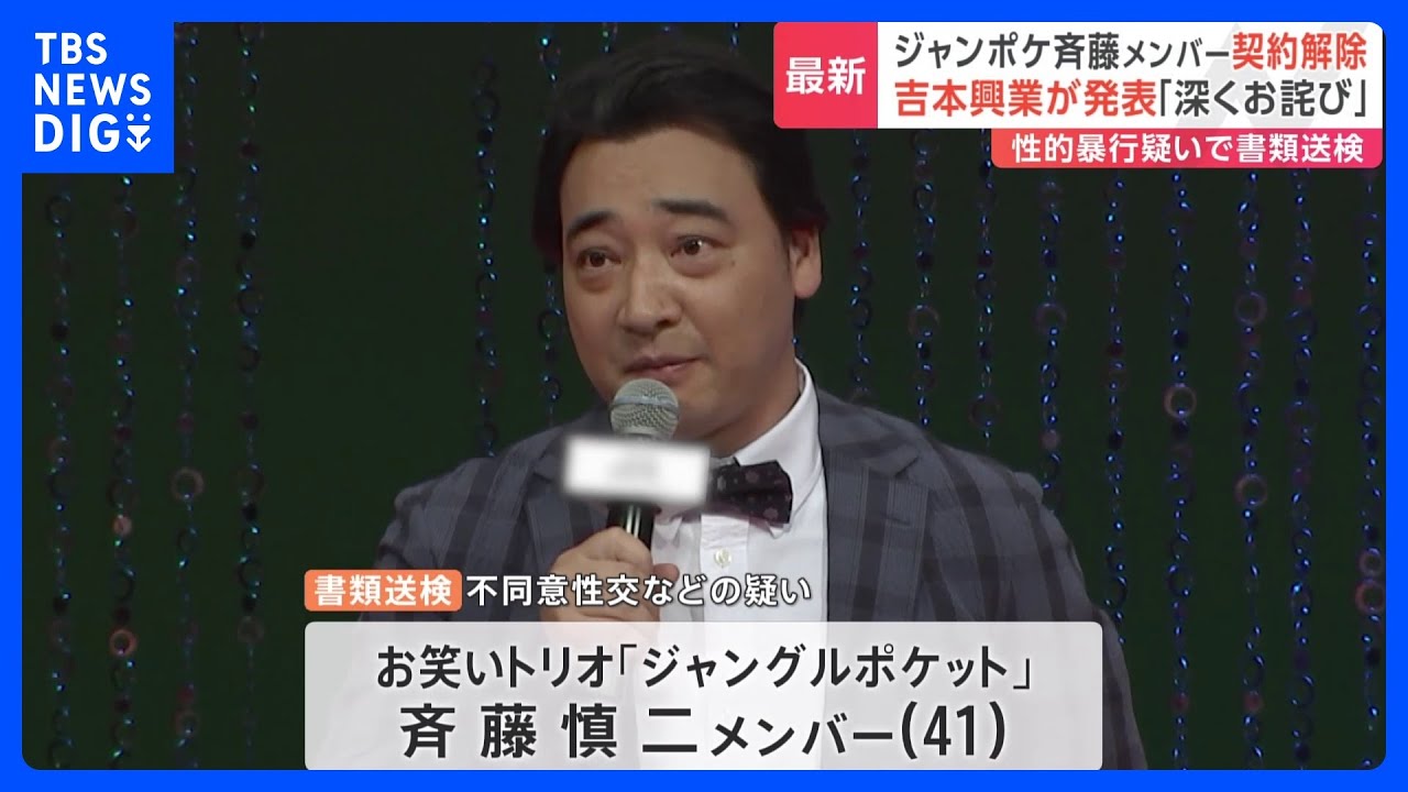 お笑いトリオ「ジャングルポケット」の斉藤慎二メンバーが、20代の女性に性的暴行を加えたなどとして、書類送検されました。所属事務所の吉本興業は先ほど、斉藤メンバーとの契約を解除したと発表しました。