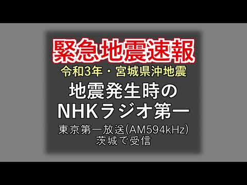 20日の地震発生時のNHK東京第一放送 (R1) です。 緊急地震速報の途中から収録したため、最初の数秒間は再現した音源を使用しております。 時報が収録できていないため、震度などのリアルタイム情報は動画に入れていません。 動画内のテロップは放送から切り抜きました。 今回の地震では、通常の基準に達していない震度5強で九波全中が実施されましたが、理由は不明です。00:10 緊急地震速報 01:05 九波全中 (原因等詳細不明) 01:17 全中終了 01:28 津波注意報 JOAKNHKラジオ九波全中地震情報宮城県沖地震東京第一放送津波注意報緊急地震速報