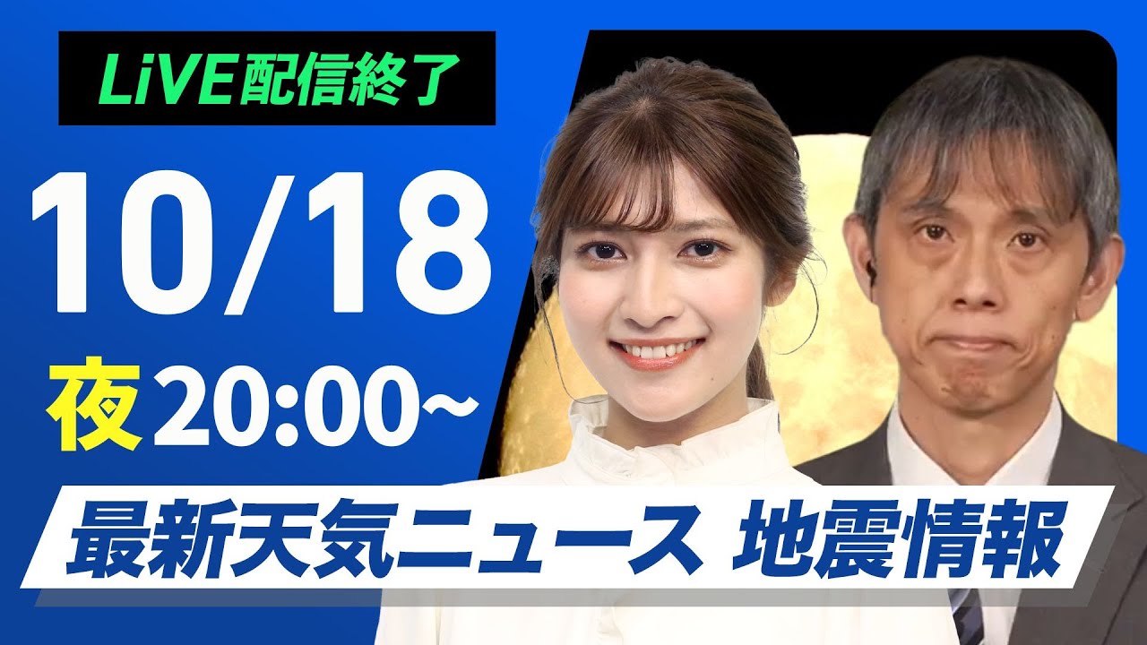 【ライブ】最新天気ニュース・地震情報2024年10月18日(金)/あすは雨風強まり荒天のおそれ〈ウェザーニュースLiVEムーン・岡本 結子リサ/芳野 達郎〉